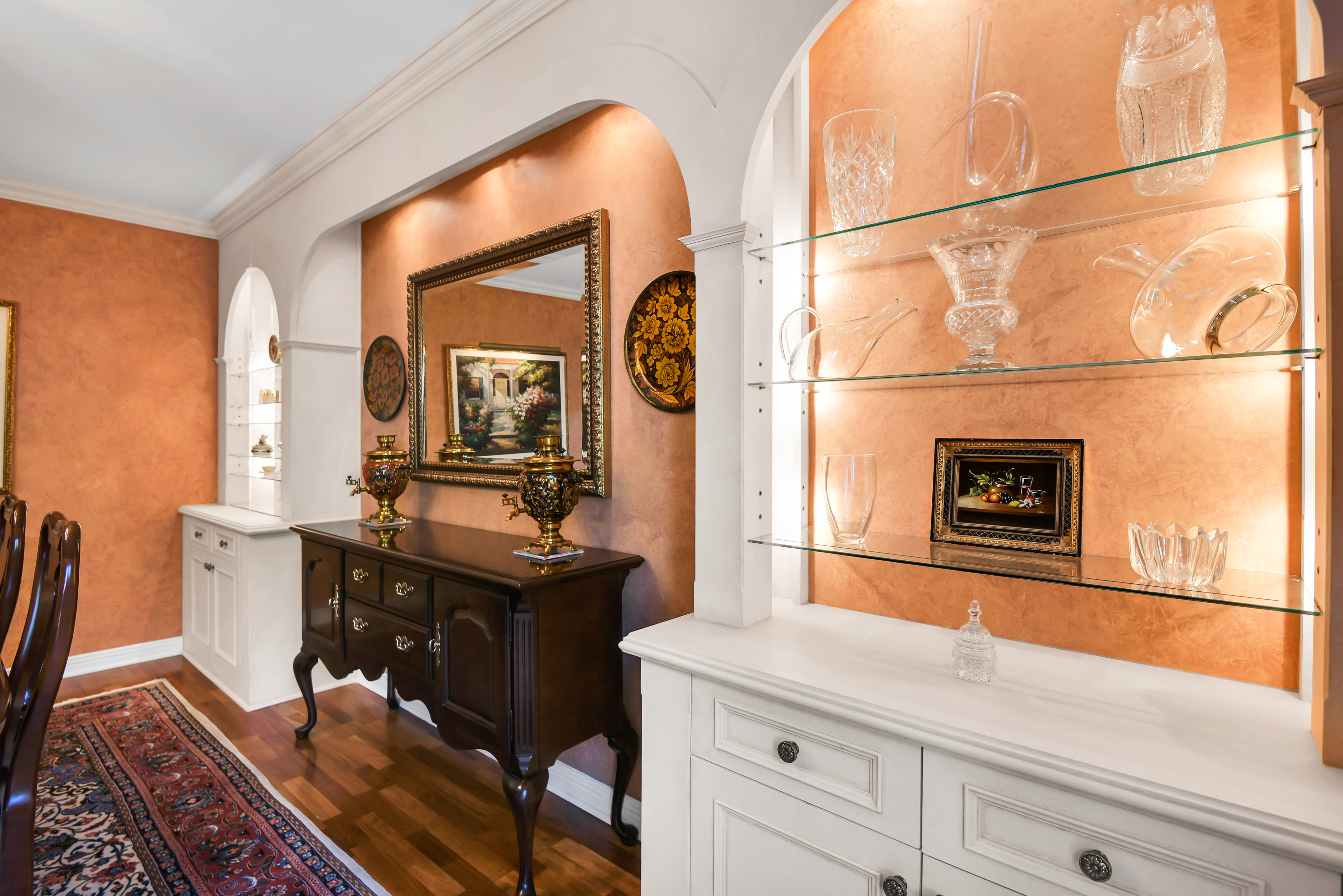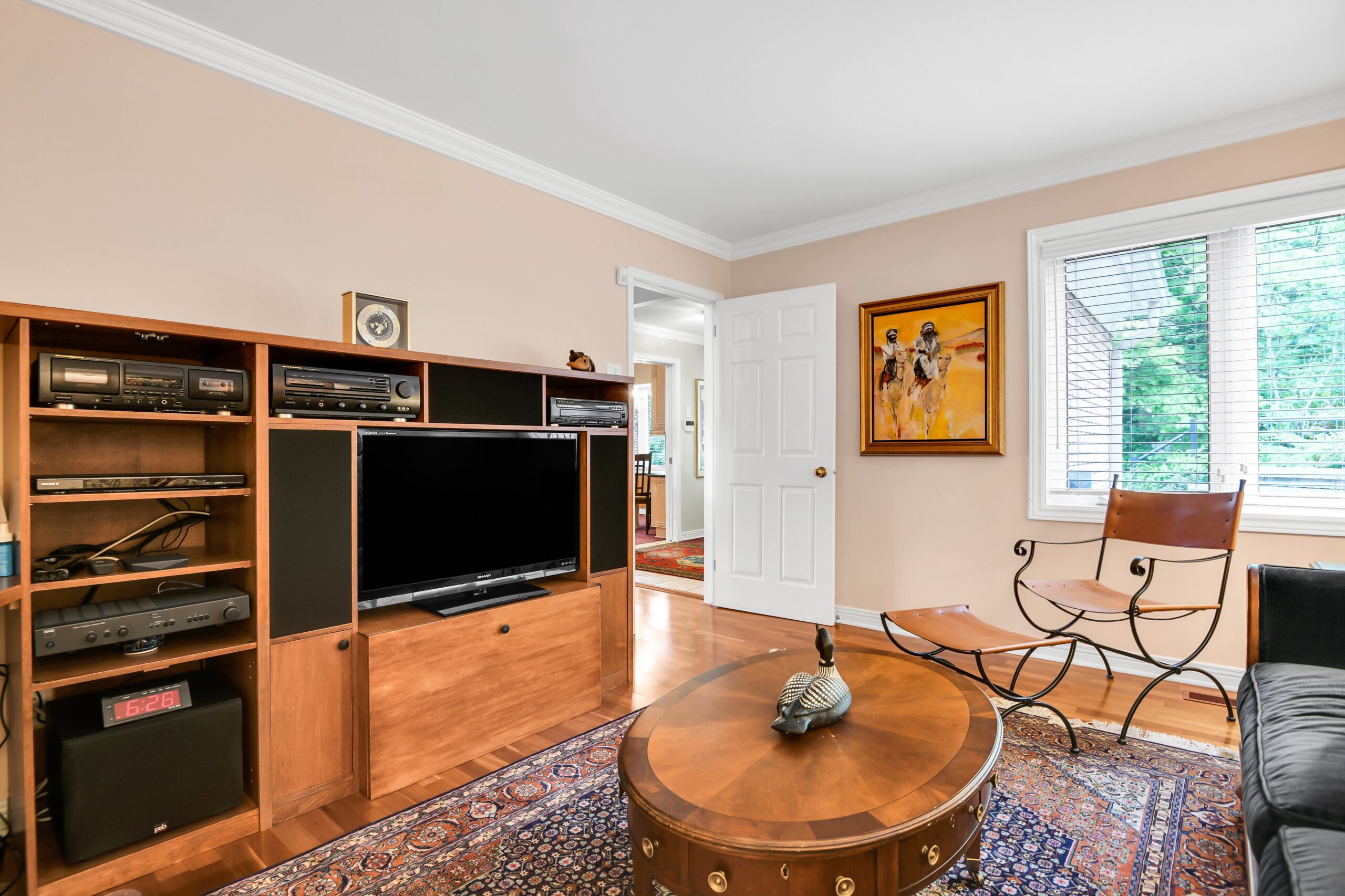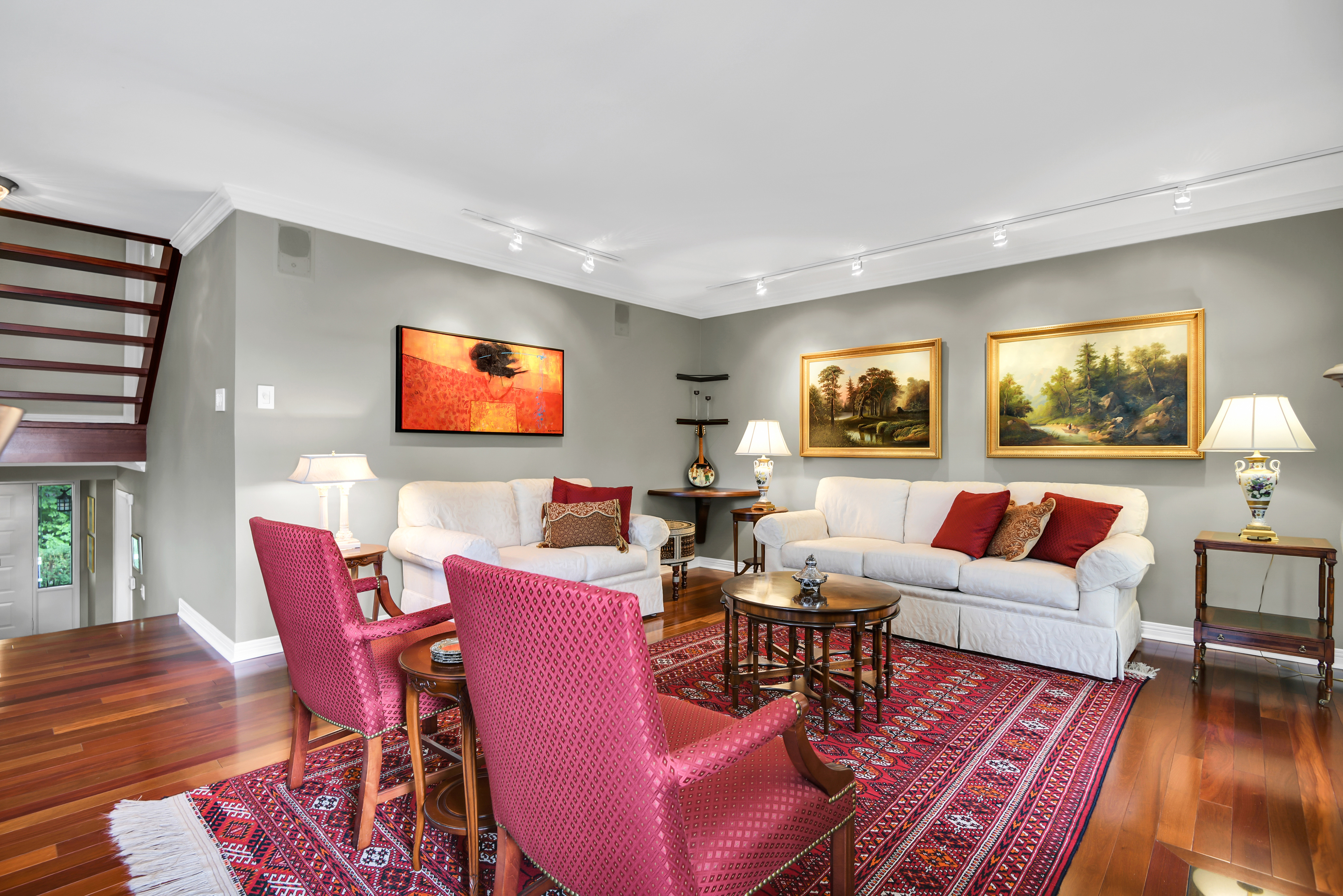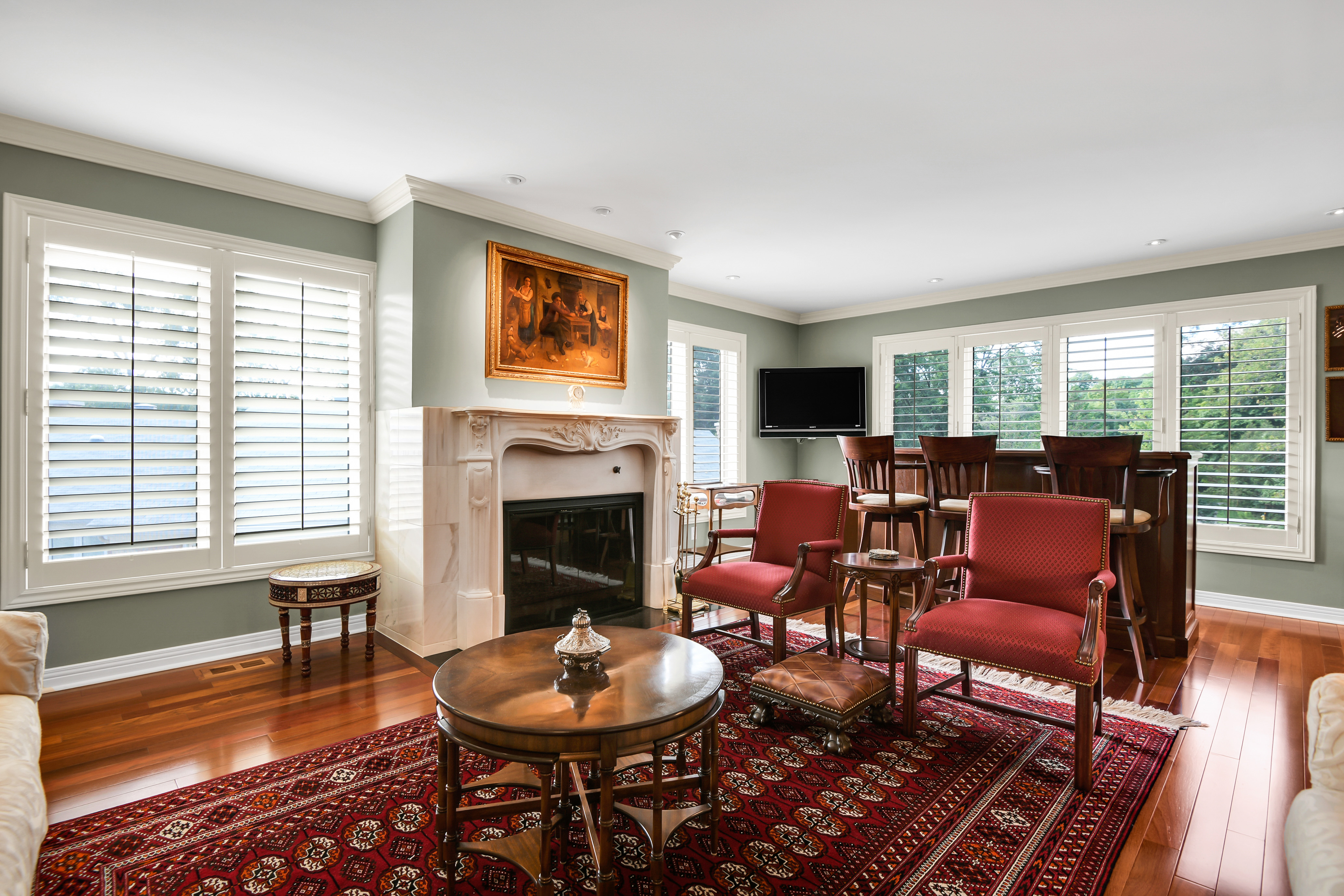 A separate den on the main level is a welcome retreat for relaxing and an ideal space for a dedicated office. A half level up is a more formal space, anchored by a stone-cast mantle over a wood-burning fireplace. The room is flooded with an abundance of light filtering through large windows. The space is designed with areas designated for conversation and complemented with a bar area that is positioned for casual conversation.