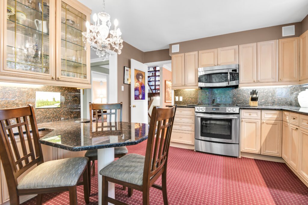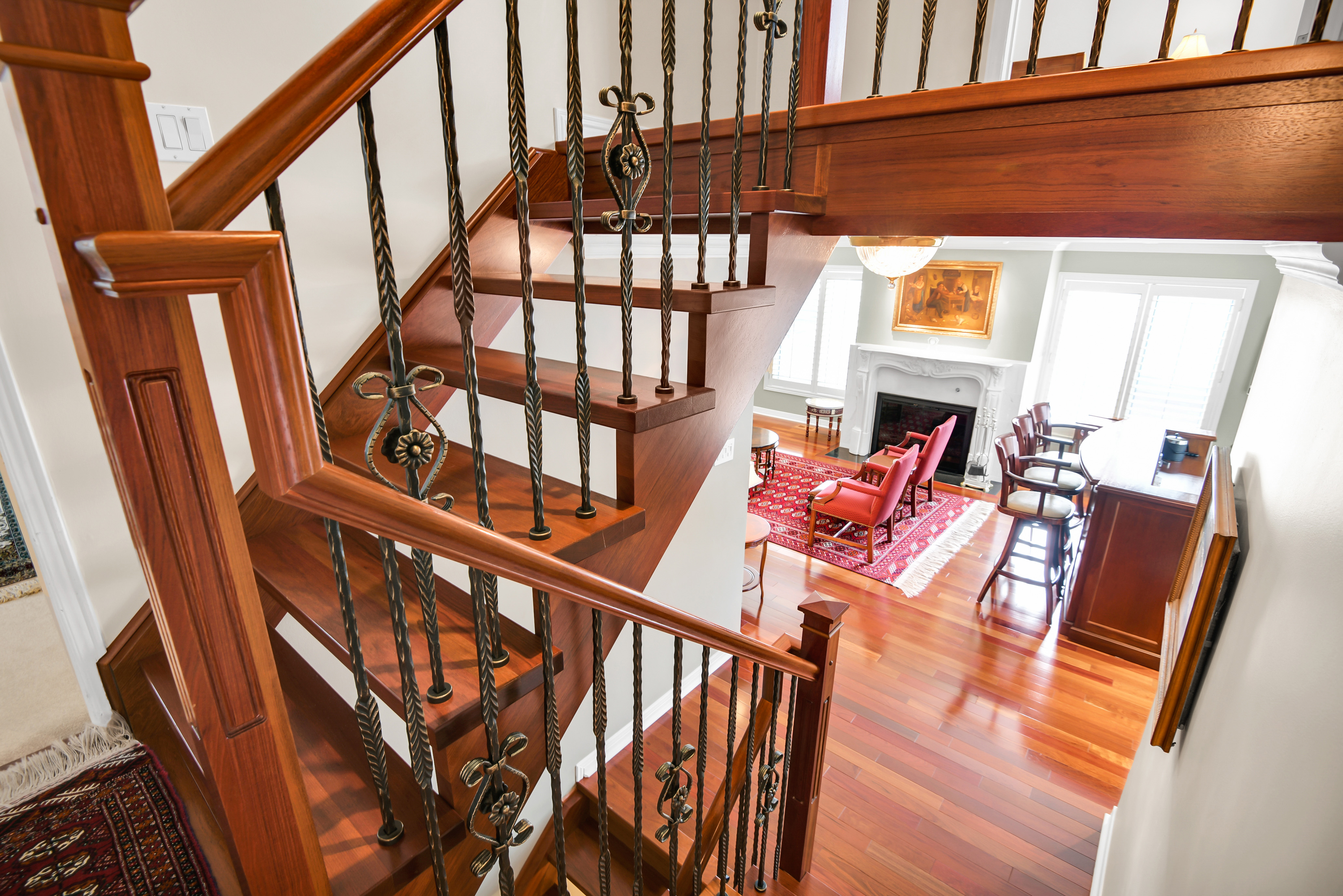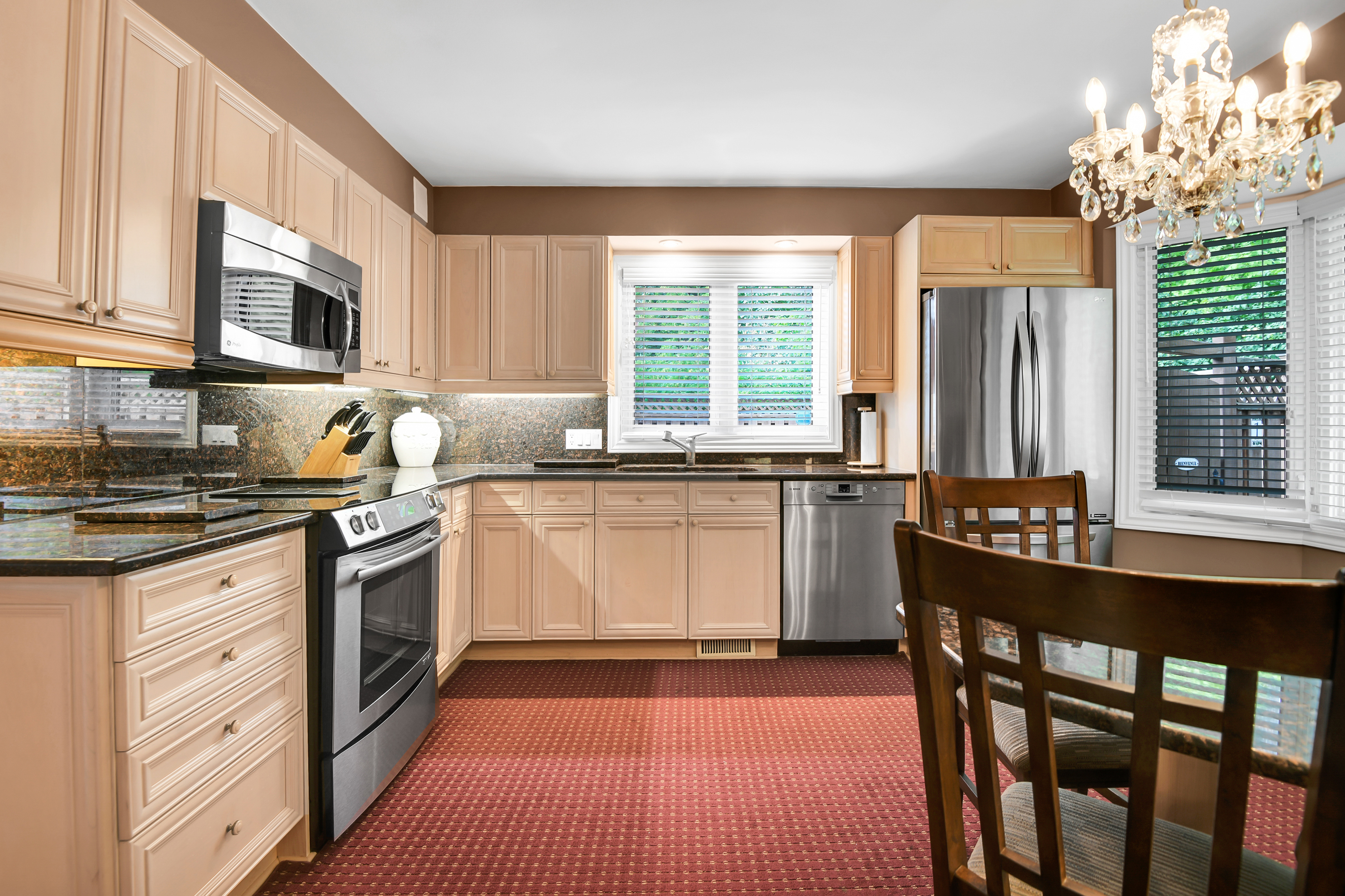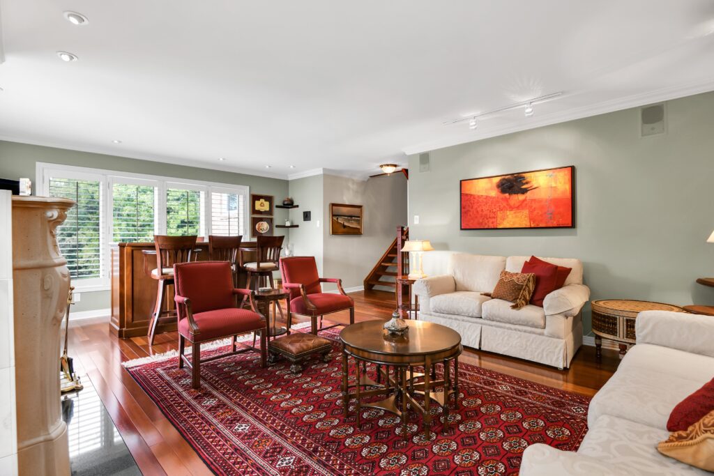 A separate den on the main level is a welcome retreat for relaxing and an ideal space for a dedicated office. A half level up is a more formal space, anchored by a stone-cast mantle over a wood-burning fireplace. The room is flooded with an abundance of light filtering through large windows. The space is designed with areas designated for conversation and complemented with a bar area that is positioned for casual conversation.