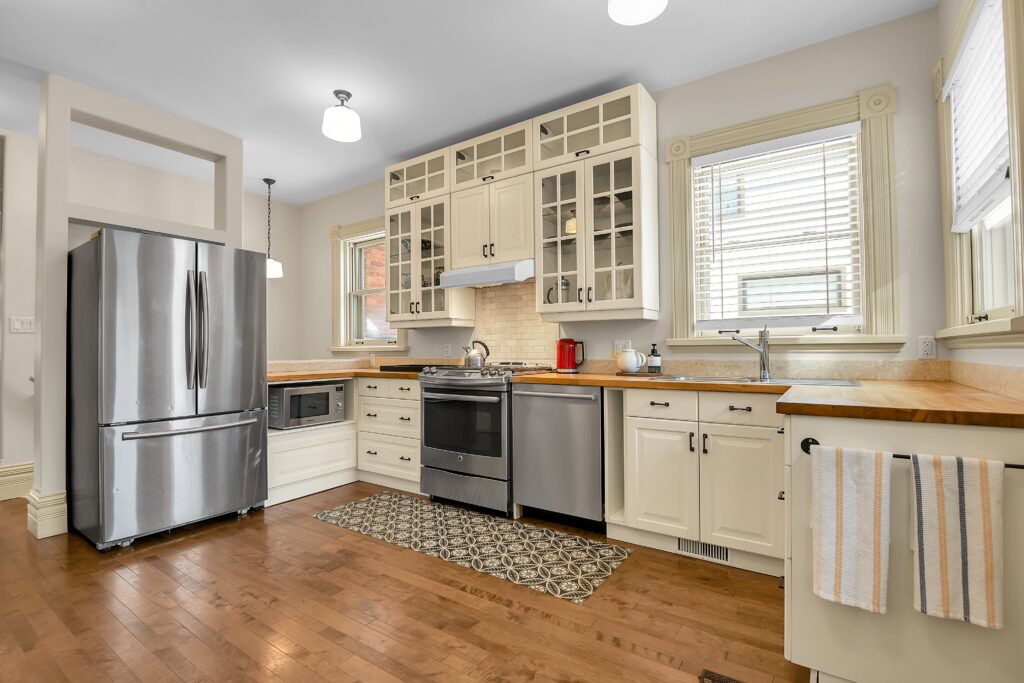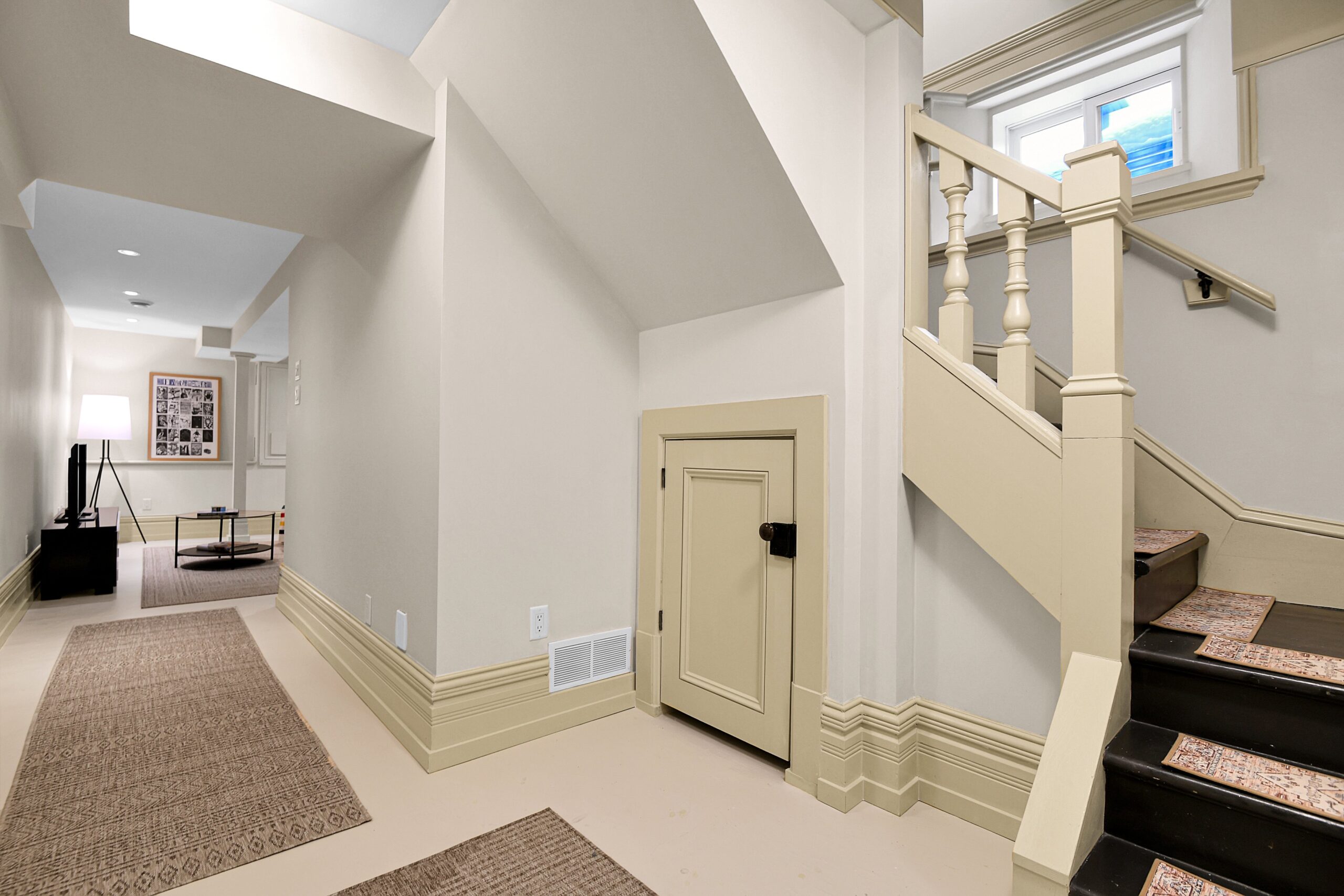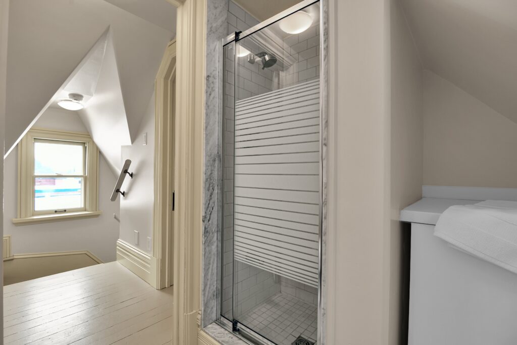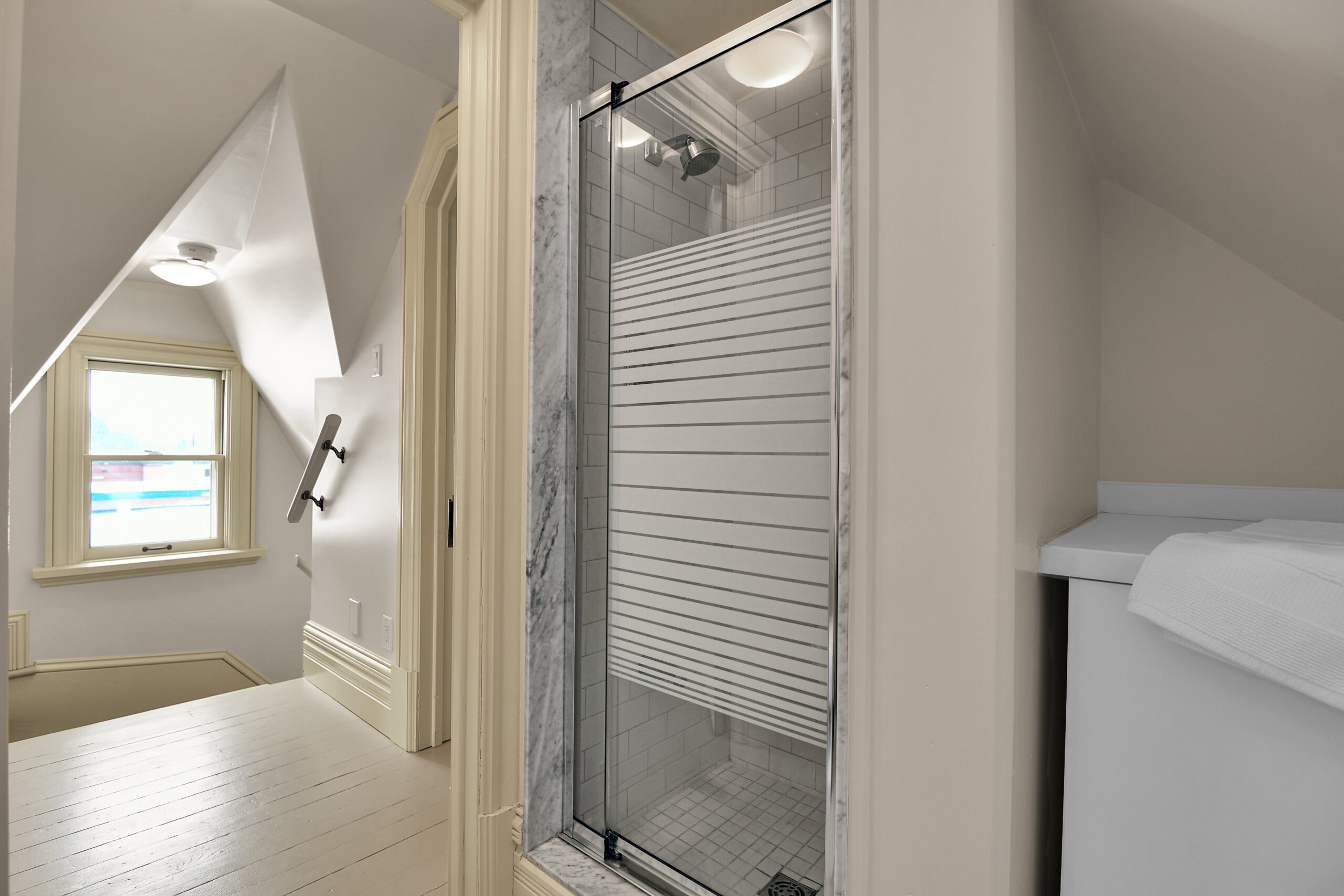 Inside, the home offers a rare combination of historic craftsmanship and modern infrastructure. The original staircase and handrails have been restored, complemented by custom solid-core interior doors, trims, and baseboards reproduced from original profiles found on site. Engineered hardwood floors grace the main level, while the original pine floors have been restored and reinstalled on the second and third levels. Comfort and efficiency were central to the renovation. Original hot water radiators were replaced with a modern forced-air heating and cooling system, supplemented by electric underfloor heating in both second-level bathrooms. Custom wood double-hung windows and new window sills on the east side further enhance performance and authenticity.