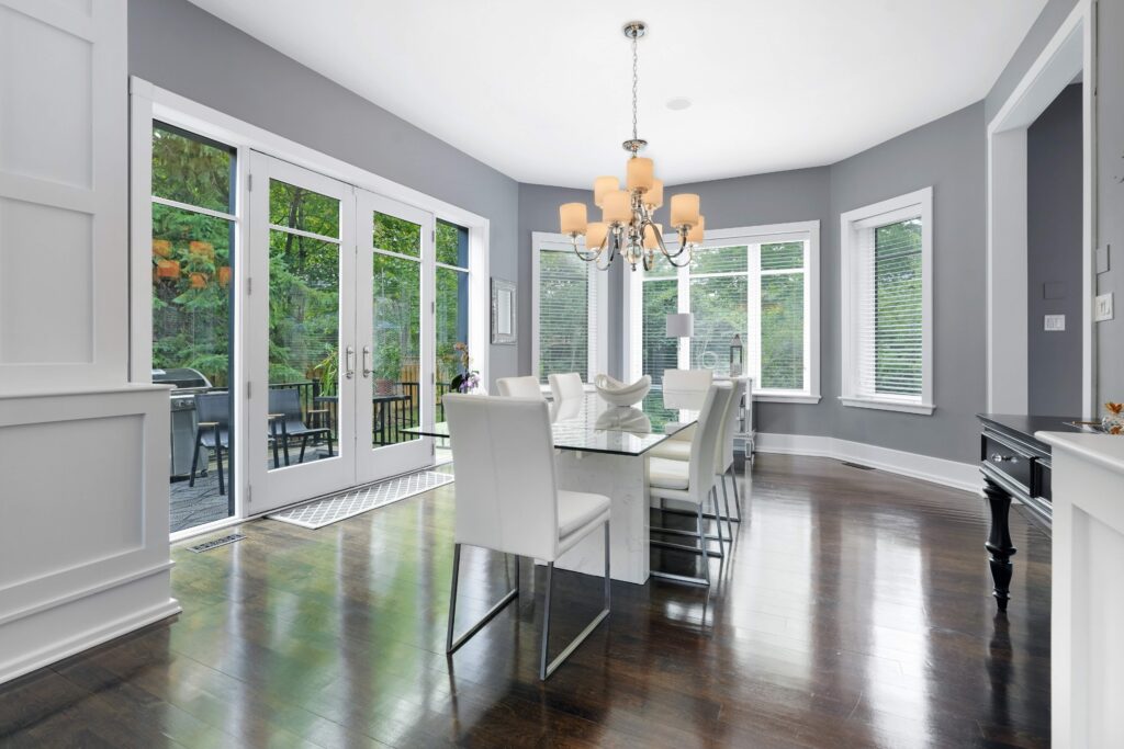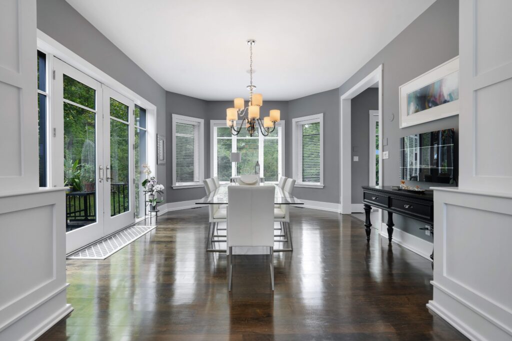 Step inside and you are immediately welcomed by soaring 10-foot ceilings on the main level, creating a sense of grandeur and spaciousness. The formal living room is a refined retreat, anchored by a cast stone mantle framing the gas fireplace, with sunlight pouring in through large windows. Across the way, the elegant dining room offers a seamless transition outdoors, with French doors leading to a private terrace—perfect for quiet morning coffee or evening entertaining.