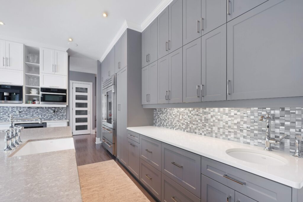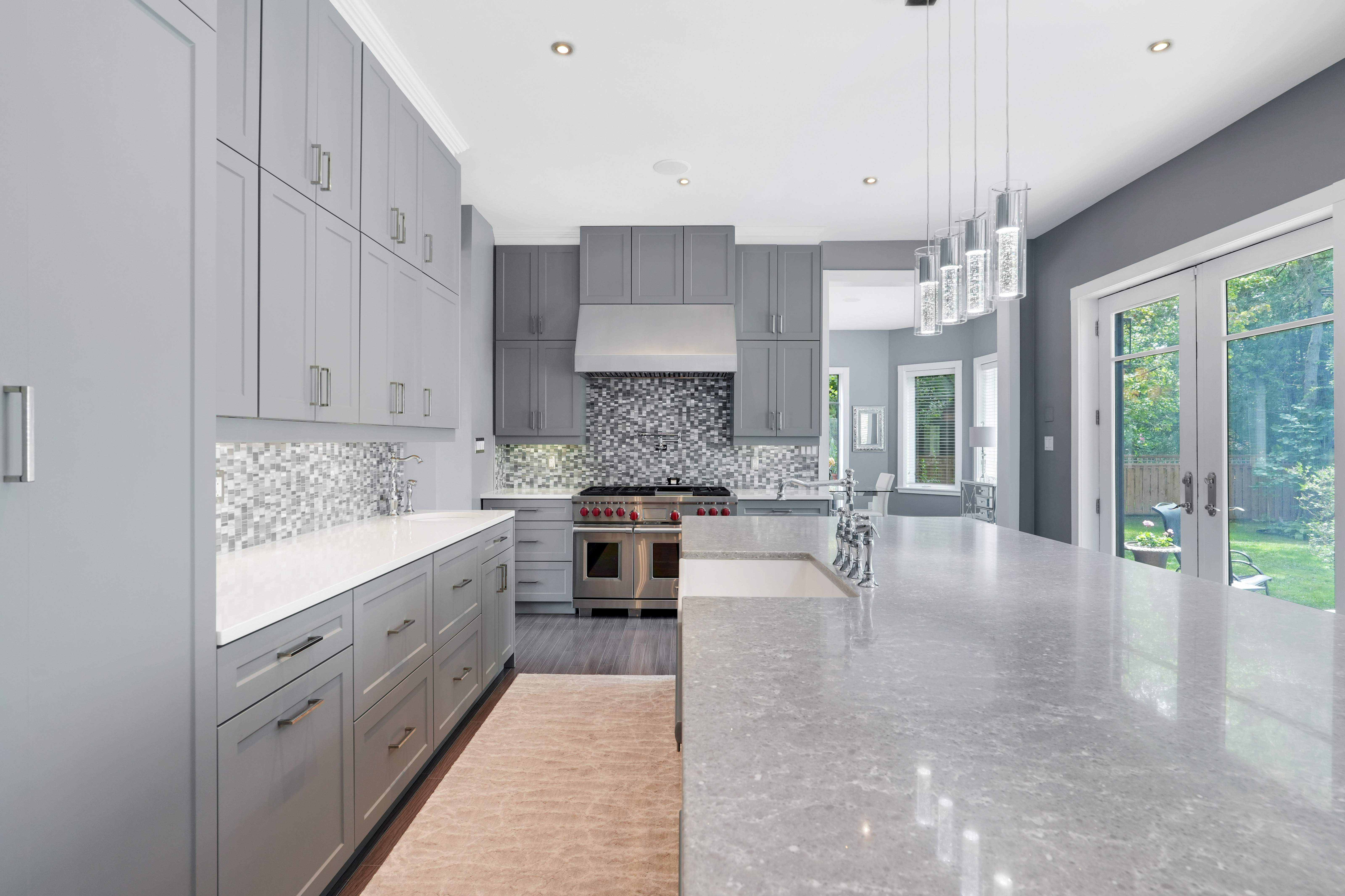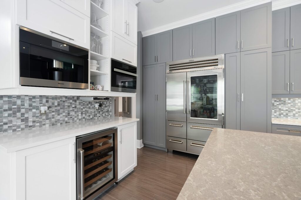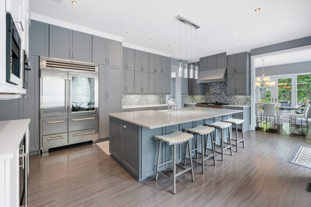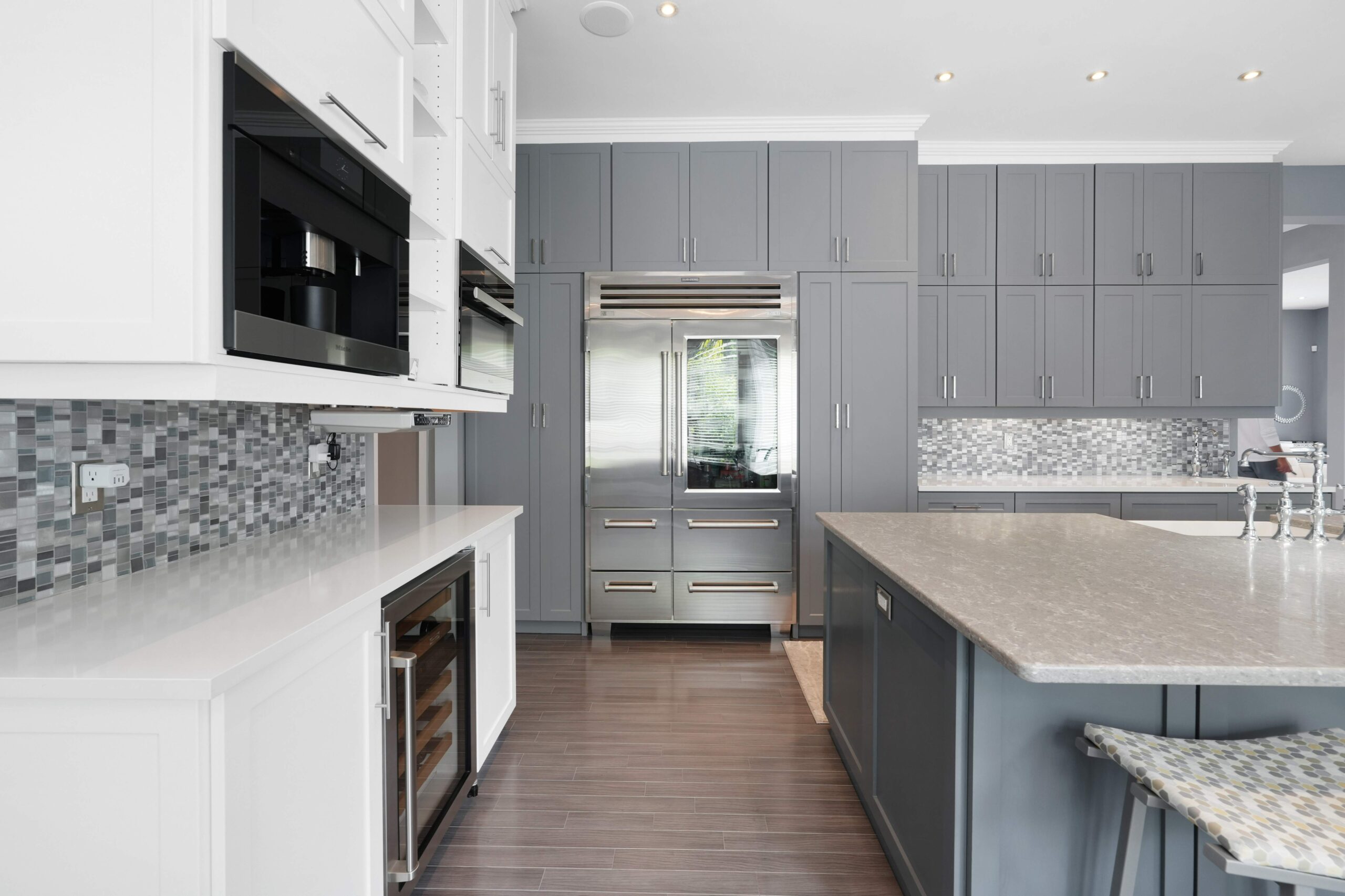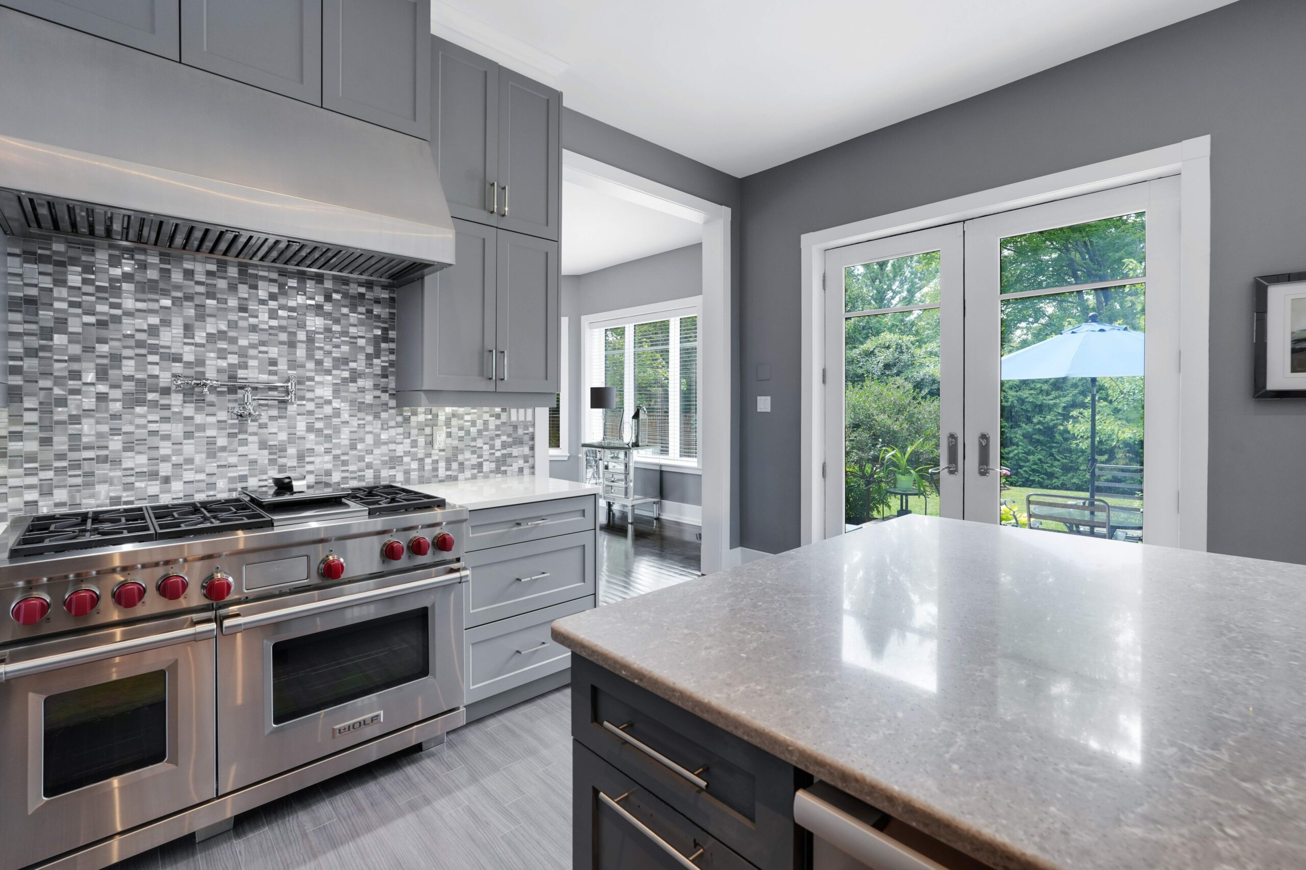 The kitchen is a true centerpiece of the home, designed to blend beauty with everyday functionality. At its heart lies a generous island that serves as both a workspace and a casual gathering spot. A classic farmhouse sink with a graceful bridge faucet is flanked by integrated dishwashers for convenience, while a 36-inch Wolf range with pot filler elevates cooking to a professional level. Completing the space is a Sub-Zero refrigerator and full-height shaker cabinetry, providing abundant storage and a timeless, polished aesthetic.