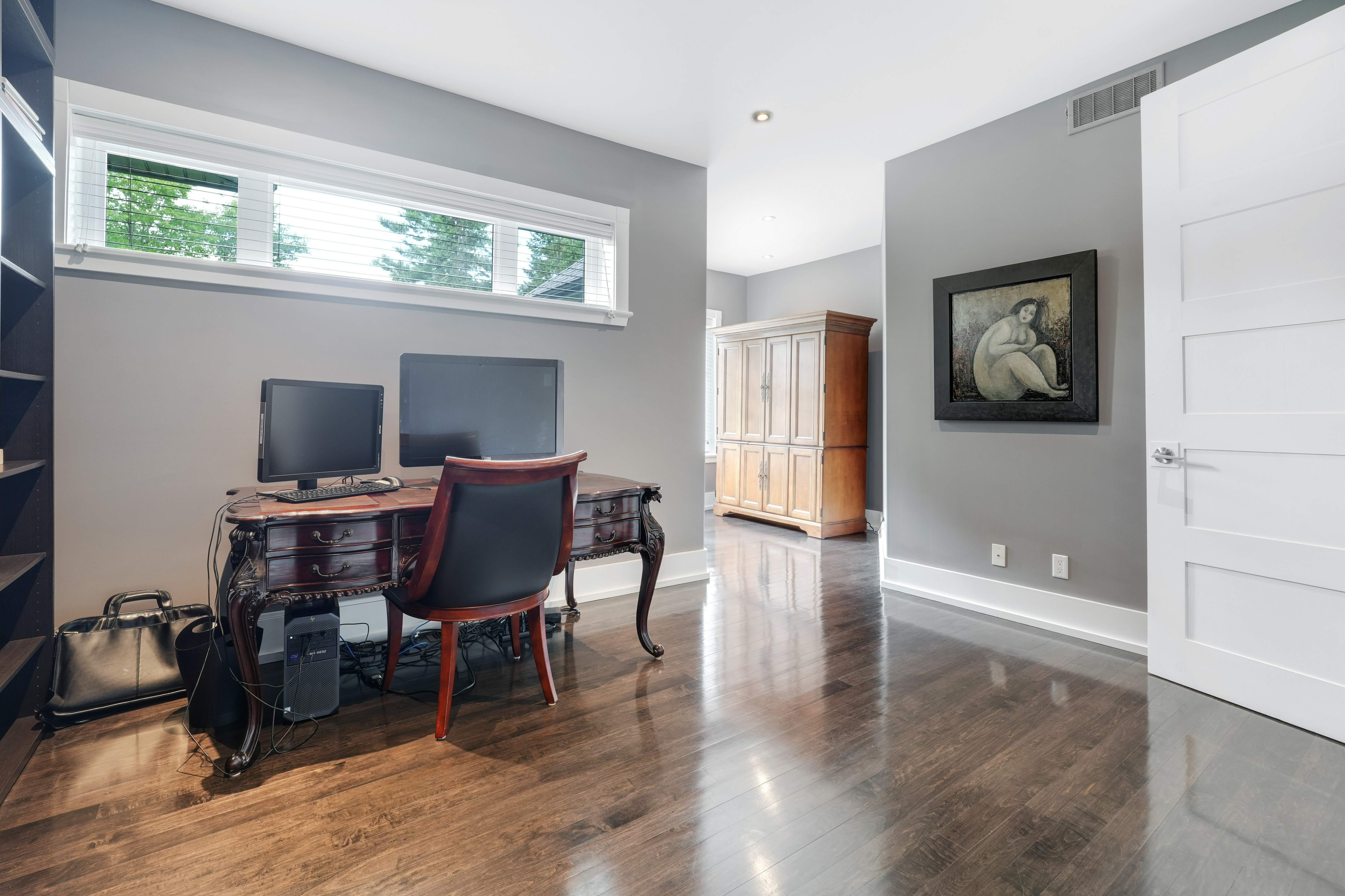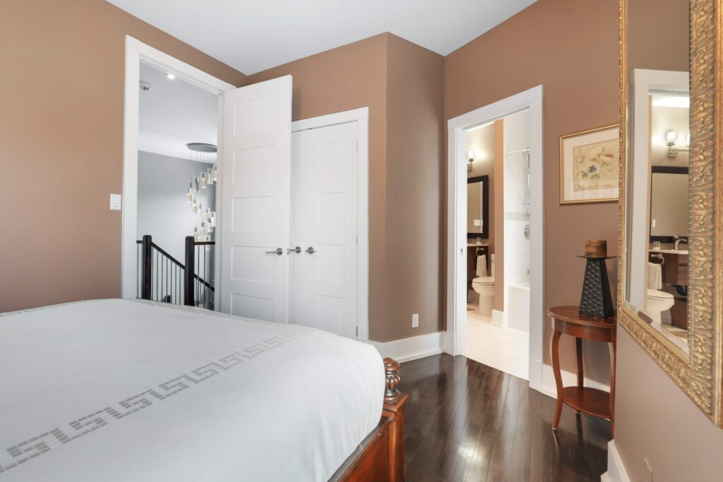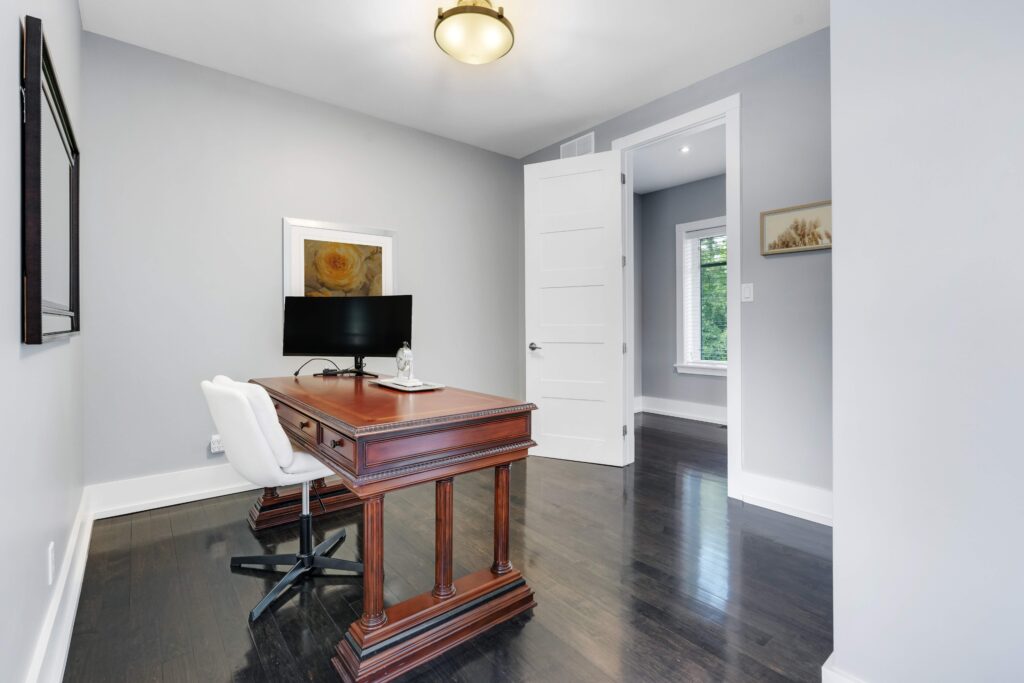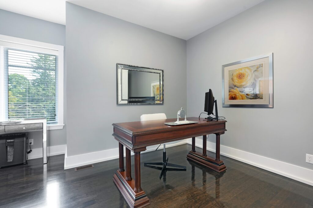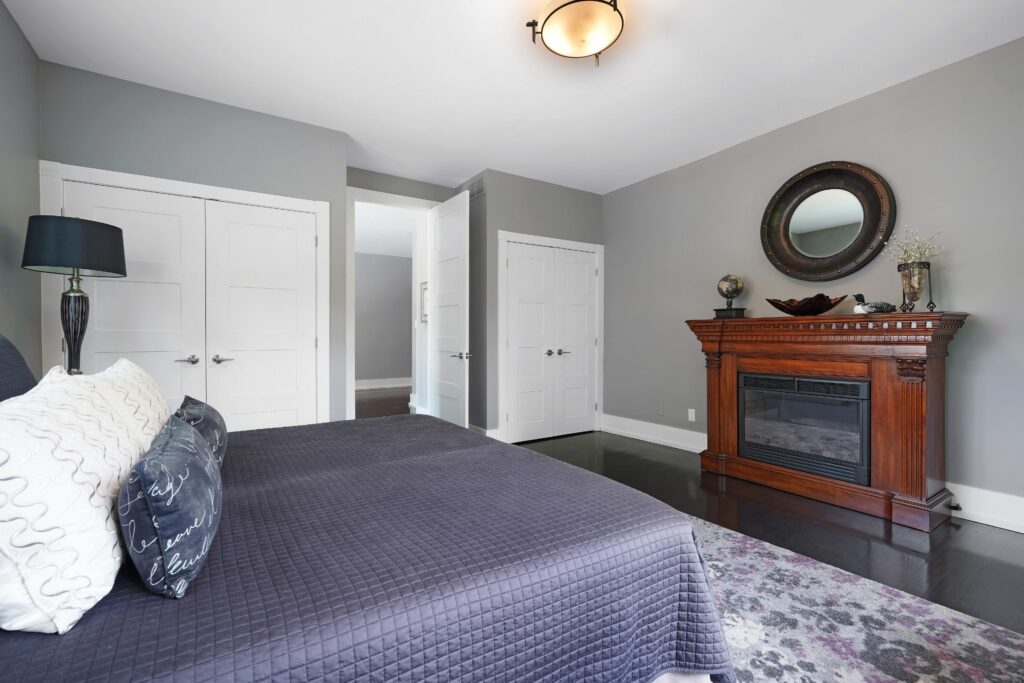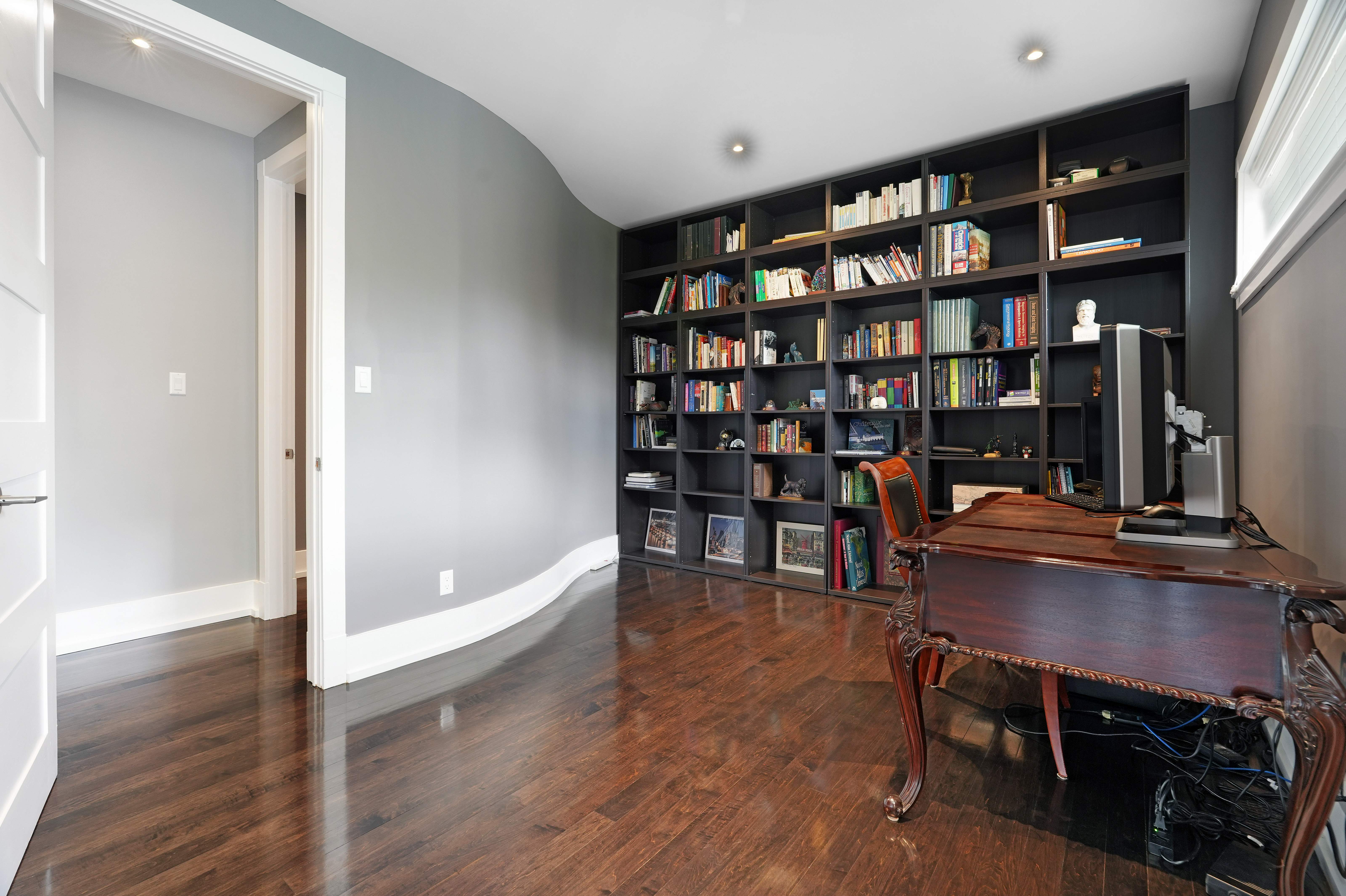 Upstairs, the second level offers generous living quarters with five bedrooms, thoughtfully arranged to balance comfort and privacy. The primary suite is a true retreat, featuring a cozy fireplace, a luxuriously appointed ensuite, and a private salon—currently used as an office, but adaptable as a dressing room, nursery, or sitting room. Two bedrooms share a well-planned Jack-and-Jill ensuite, another enjoys its own private bath, and the fourth is flooded with natural light with access to a nearby guest bath. Each room is designed with scale, light, and comfort in mind, making the entire floor perfect for family living.