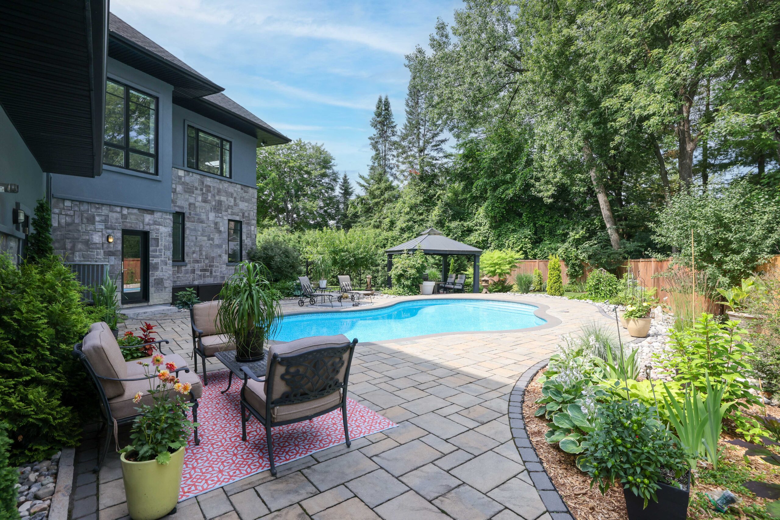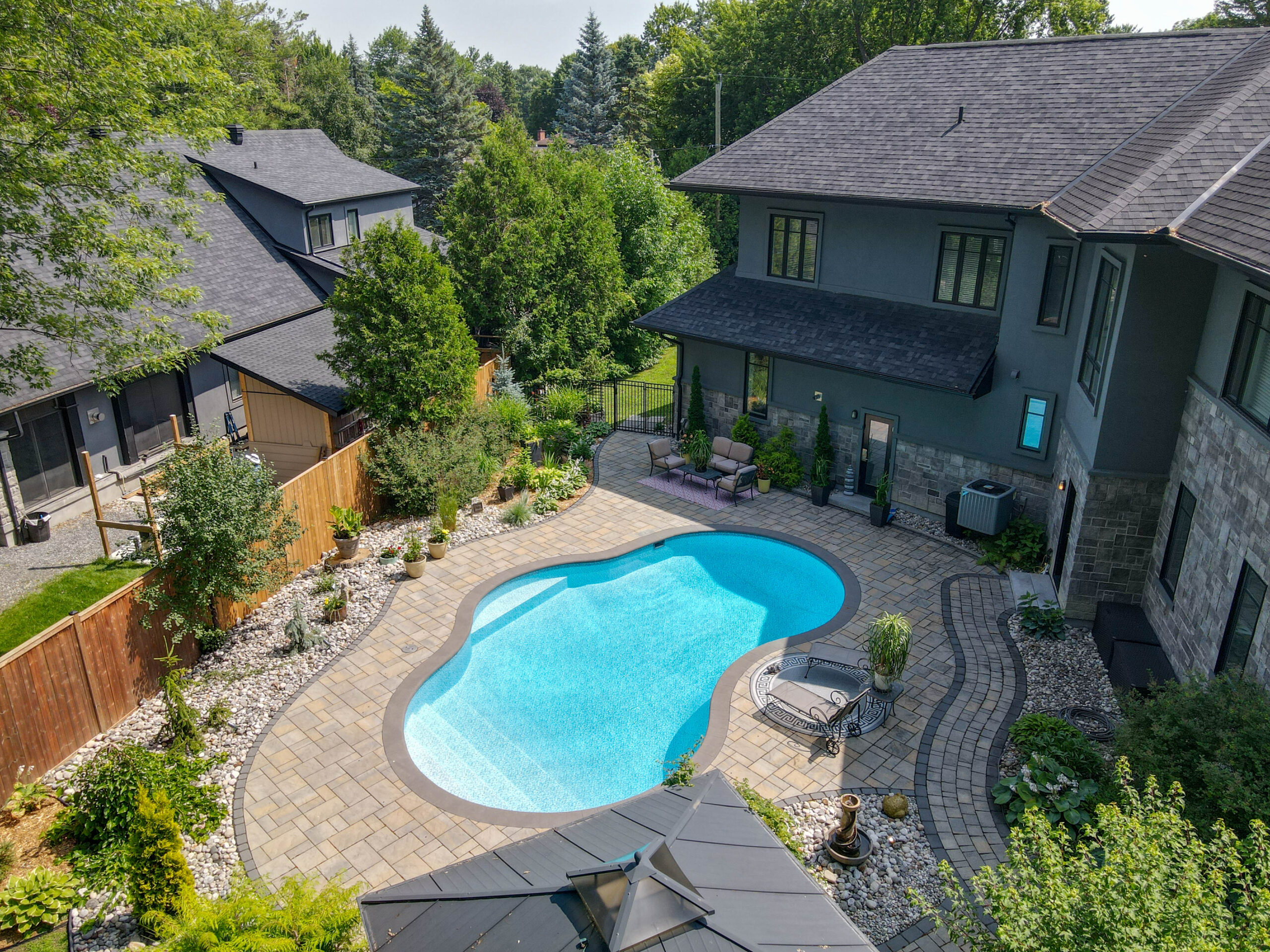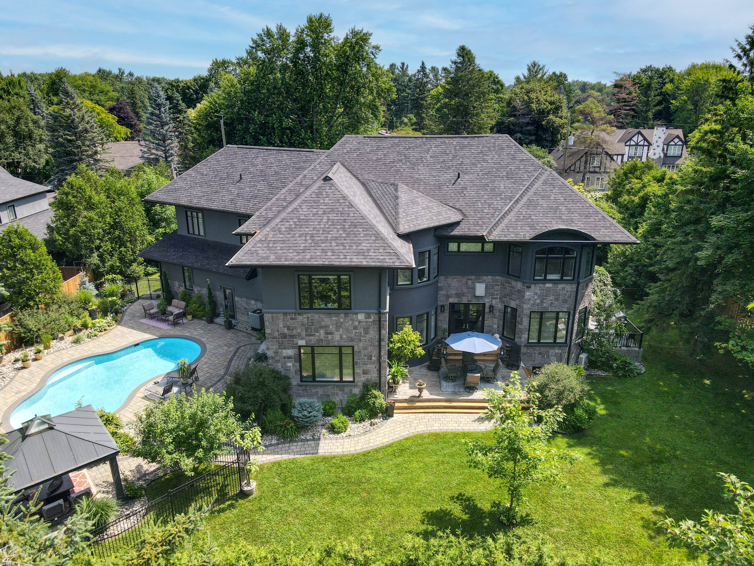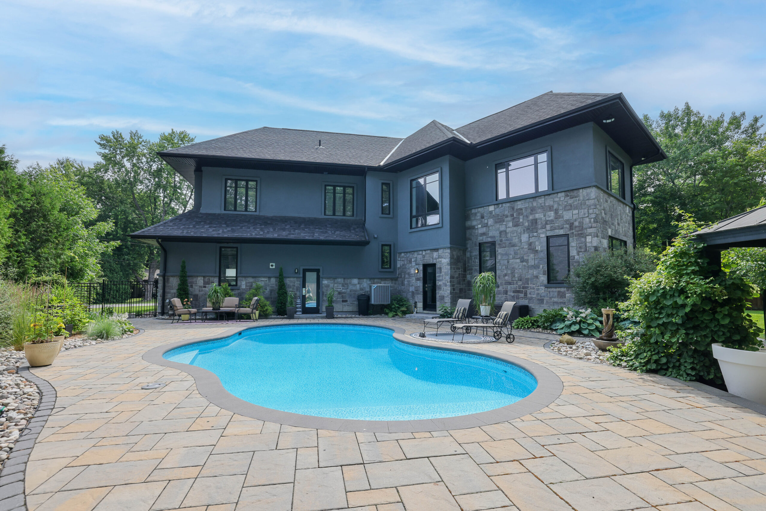 Outdoors, the landscaped grounds were designed for both beauty and privacy. The backyard is a true oasis, with a sparkling pool as its centerpiece, surrounded by lounging areas for sun seekers and shaded retreats beneath the pergola. This outdoor living space is ideal for both quiet relaxation and vibrant summer gatherings.