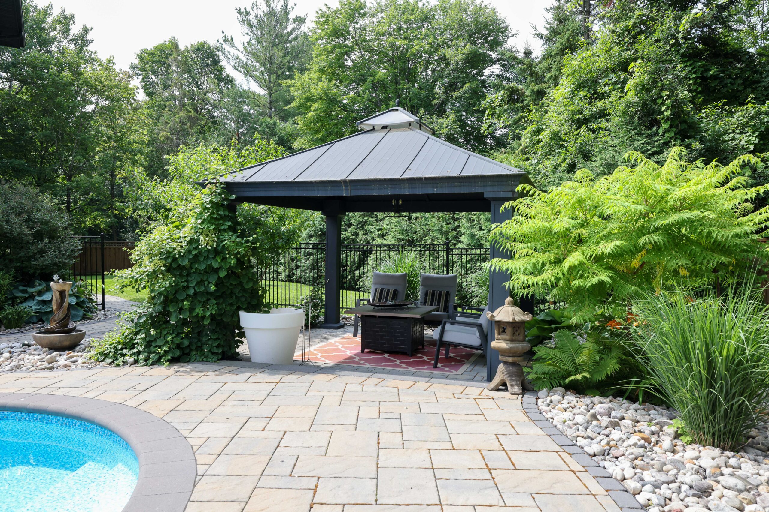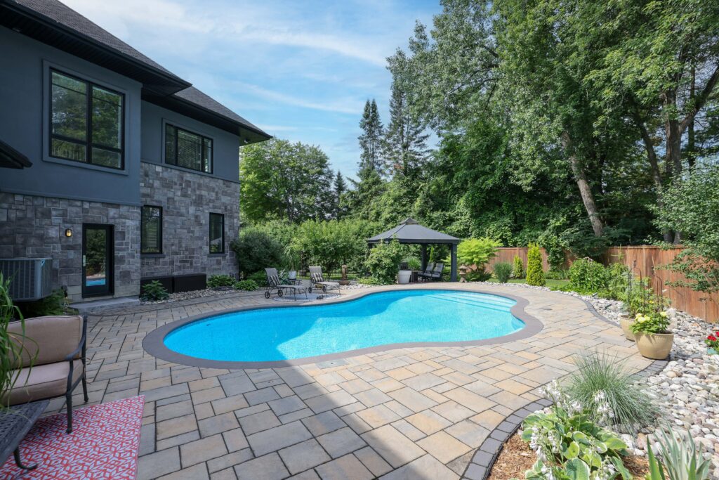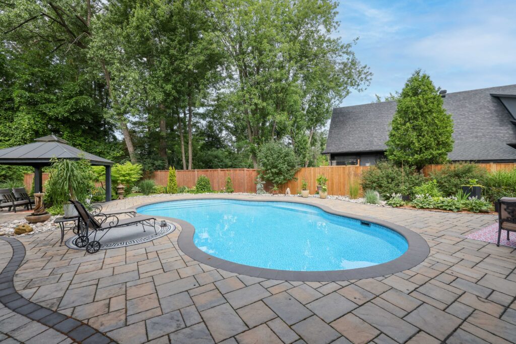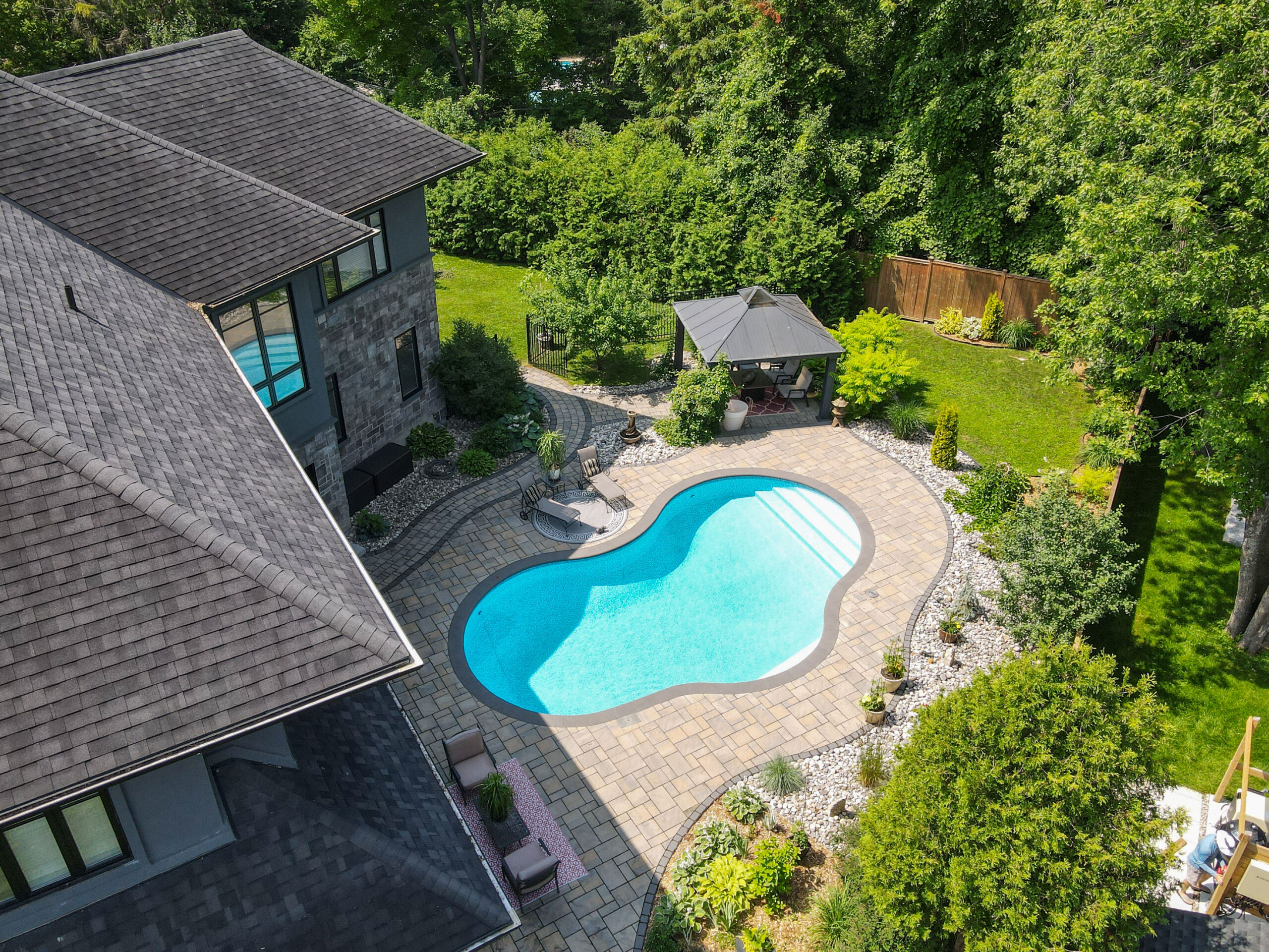 Outdoors, the landscaped grounds were designed for both beauty and privacy. The backyard is a true oasis, with a sparkling pool as its centerpiece, surrounded by lounging areas for sun seekers and shaded retreats beneath the pergola. This outdoor living space is ideal for both quiet relaxation and vibrant summer gatherings.