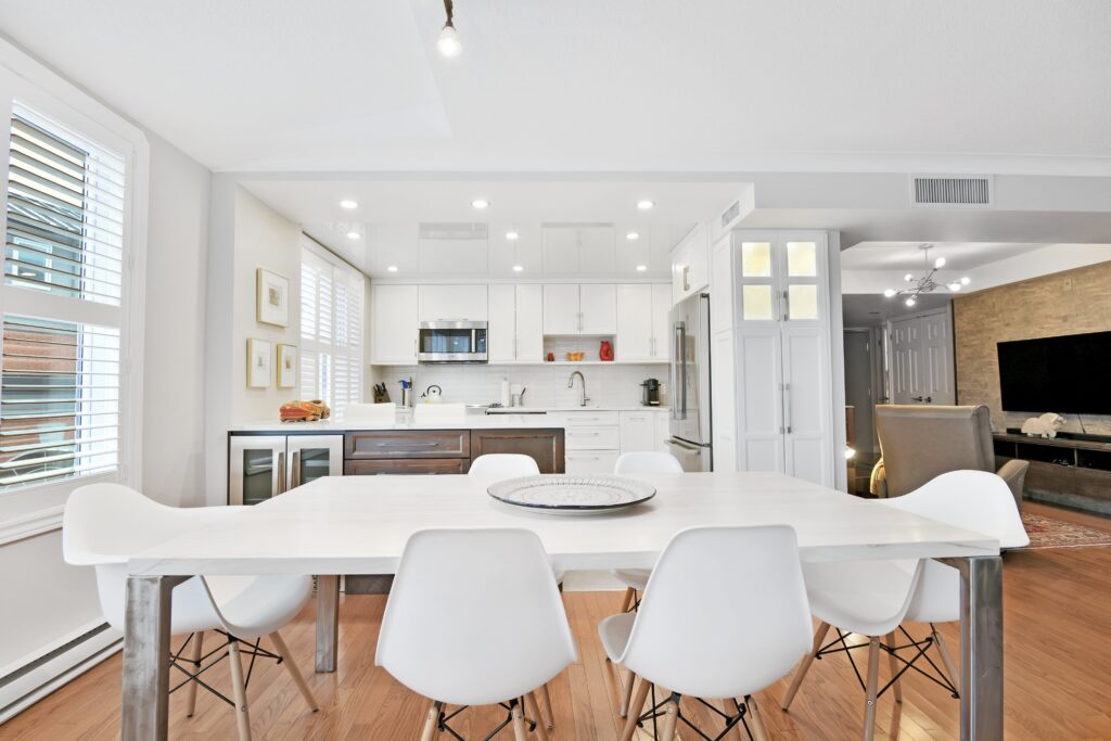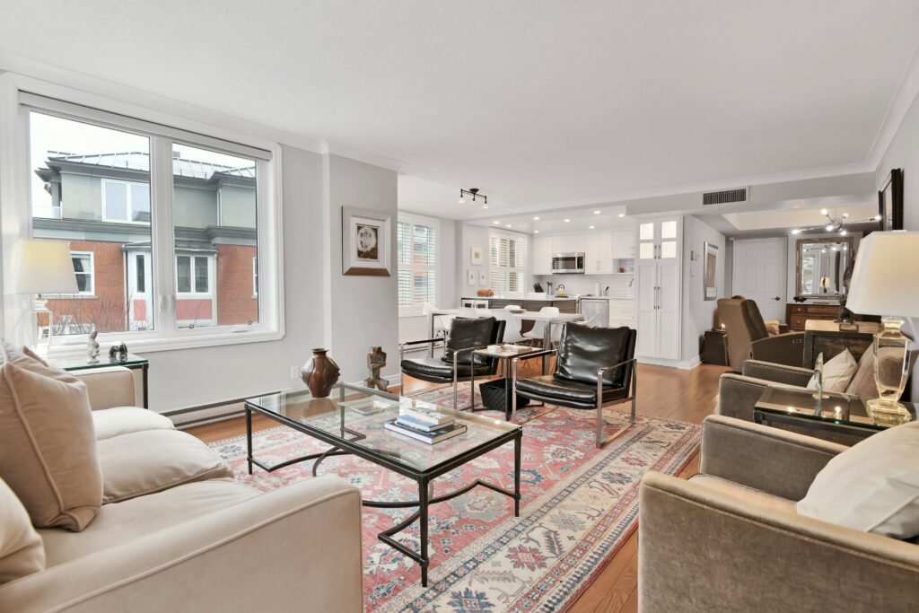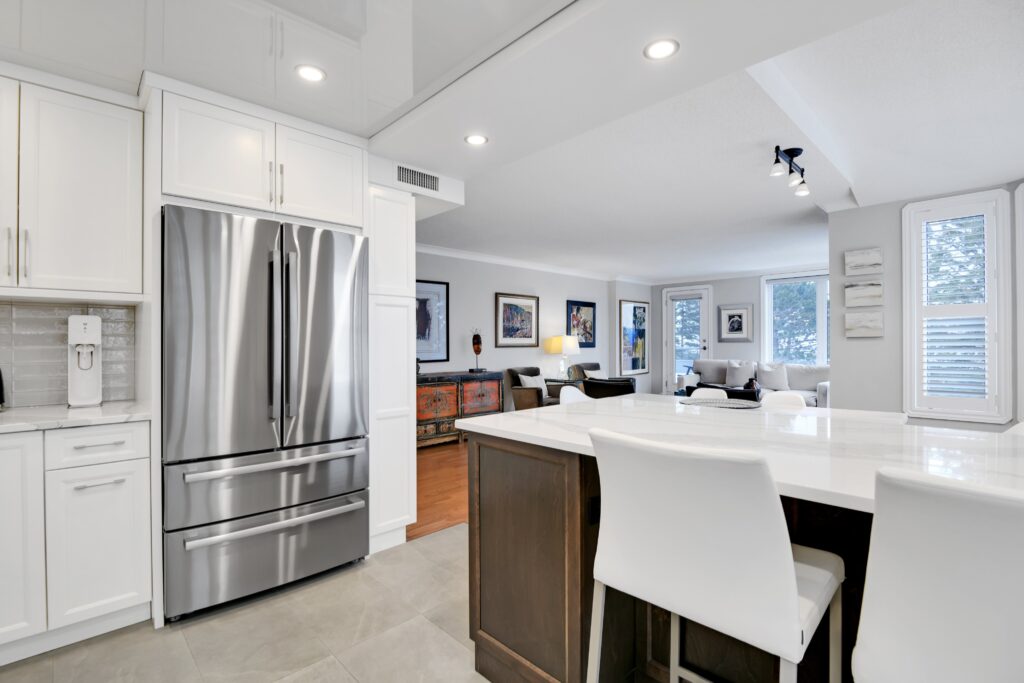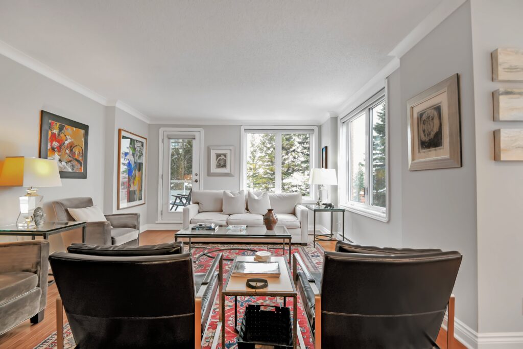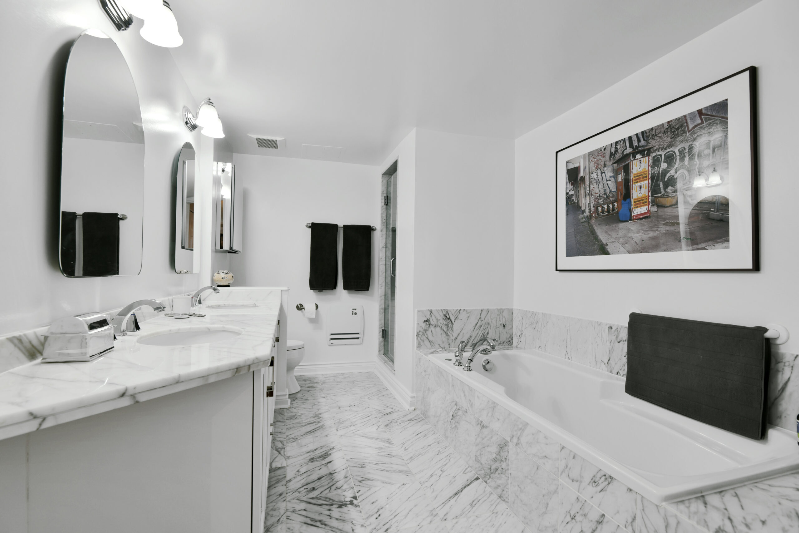 Bright and sunny with southwest exposure, this space is current and on-trend. Flooded with natural light all day long, it features balcony views of the fountain and Peace Tower views from the guest room. Reimagined with panache, it features warm engineered hardwood floors, a stylish white island kitchen detailed with handmade subway tiles, a wine fridge, Bosch appliances and white quartz counters. Two entrances provide access to the balcony that can be sheltered from sun and rain with a bistro-like awning. The floor plan works well with a separate dining area as well as space for enjoying movie nights with a more formal space in which to entertain. Two bedrooms (one currently functions as an office)and two baths are designed to allow for privacy and “away space.”The primary suite is well-scaled with additional access to the balcony, a walk-in closet, and a luxe 5-piece ensuite finished in luxe Carrara marble.