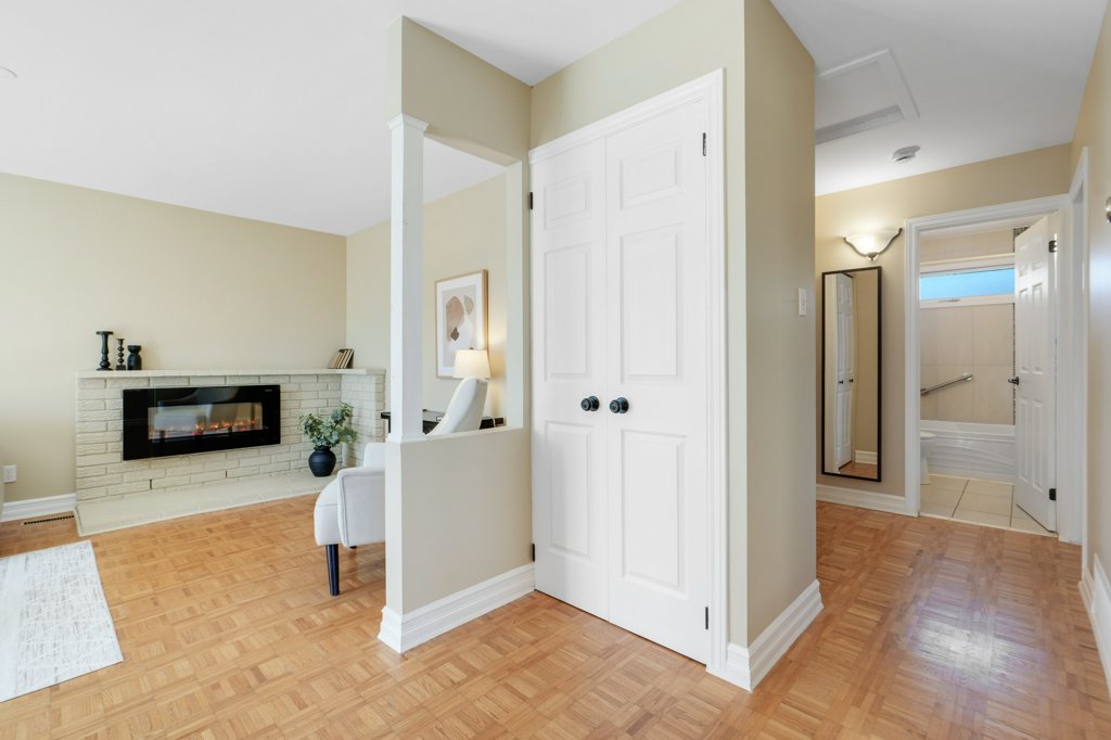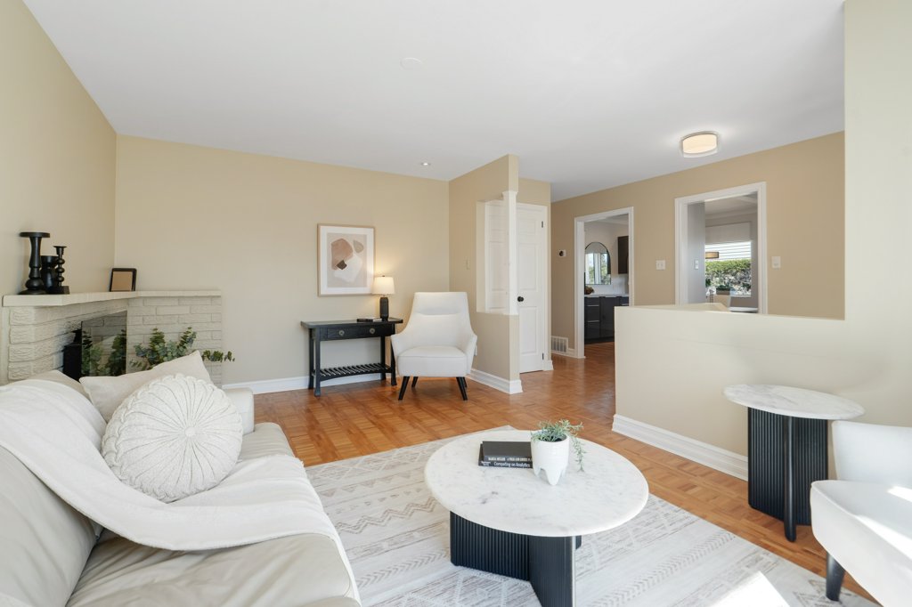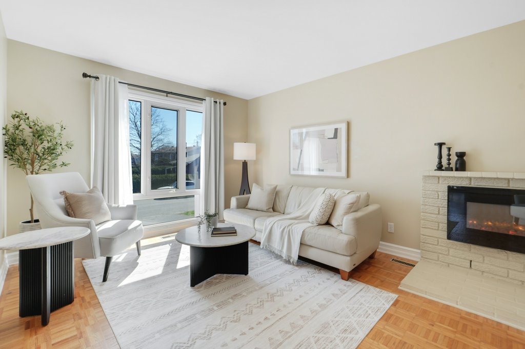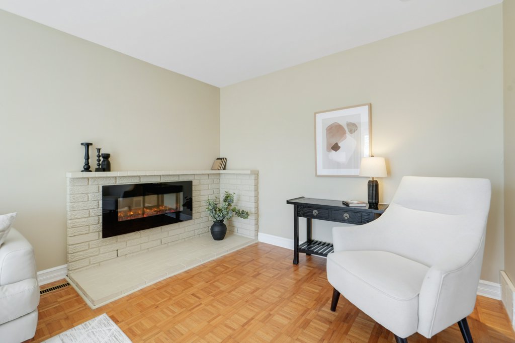 OPEN HOUSE – SUNDAY 2pm – 4pm. Boasting exceptional frontage that accommodates parking on either side, as well as a separate garage, this 4-bedroom, 2-bath high ranch-style home on a pool-sized lot in the heart of Sawmill Creek offers great options for family living. The upper level boasts a formal living room/family room that is flooded with natural daylight through a large floor-to-ceiling window. Warmed by an electric fireplace and honey-toned parquet floors, the first level feels bright and inviting and happy!