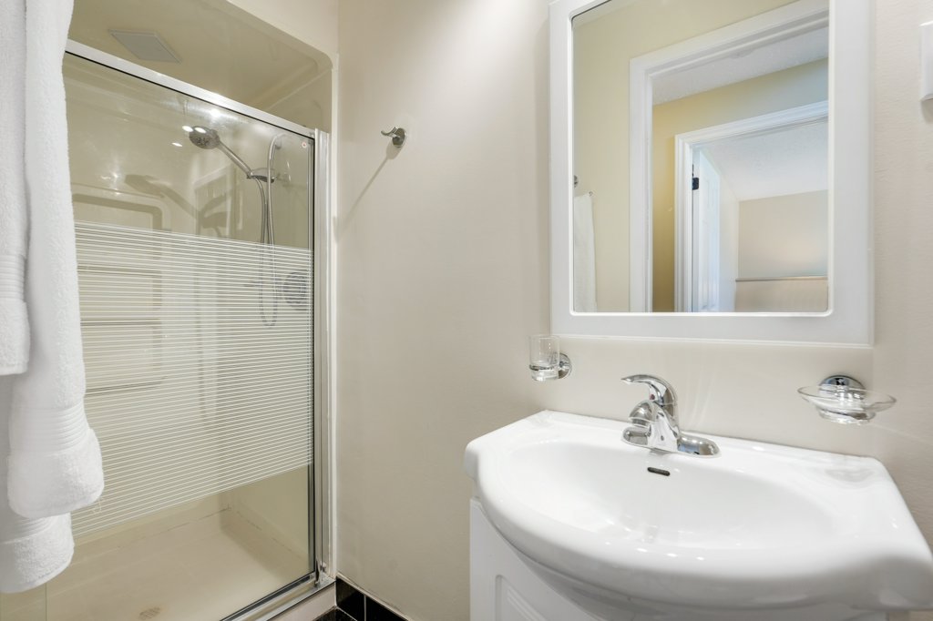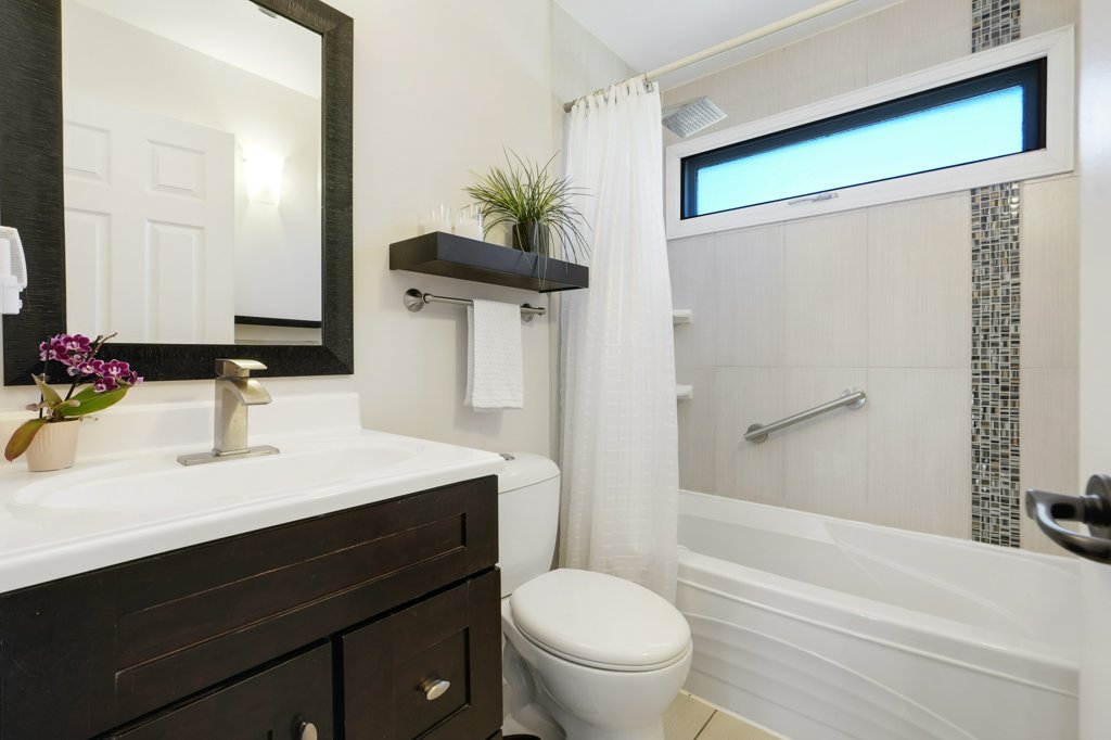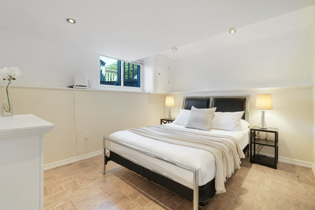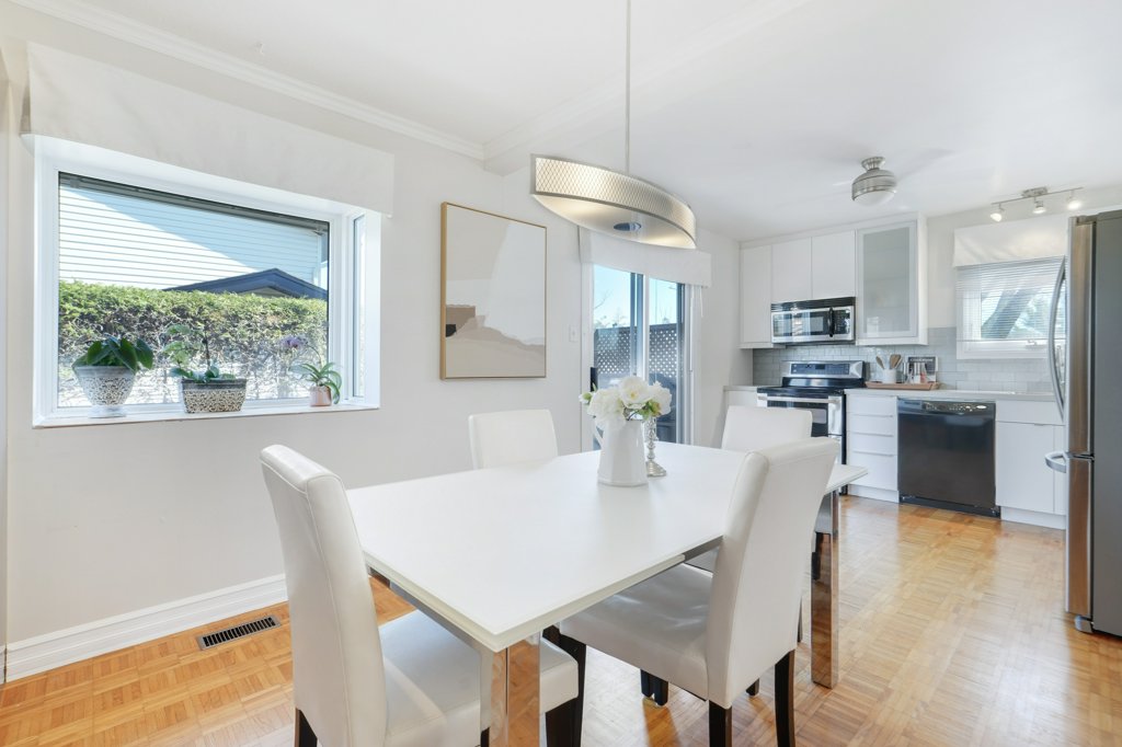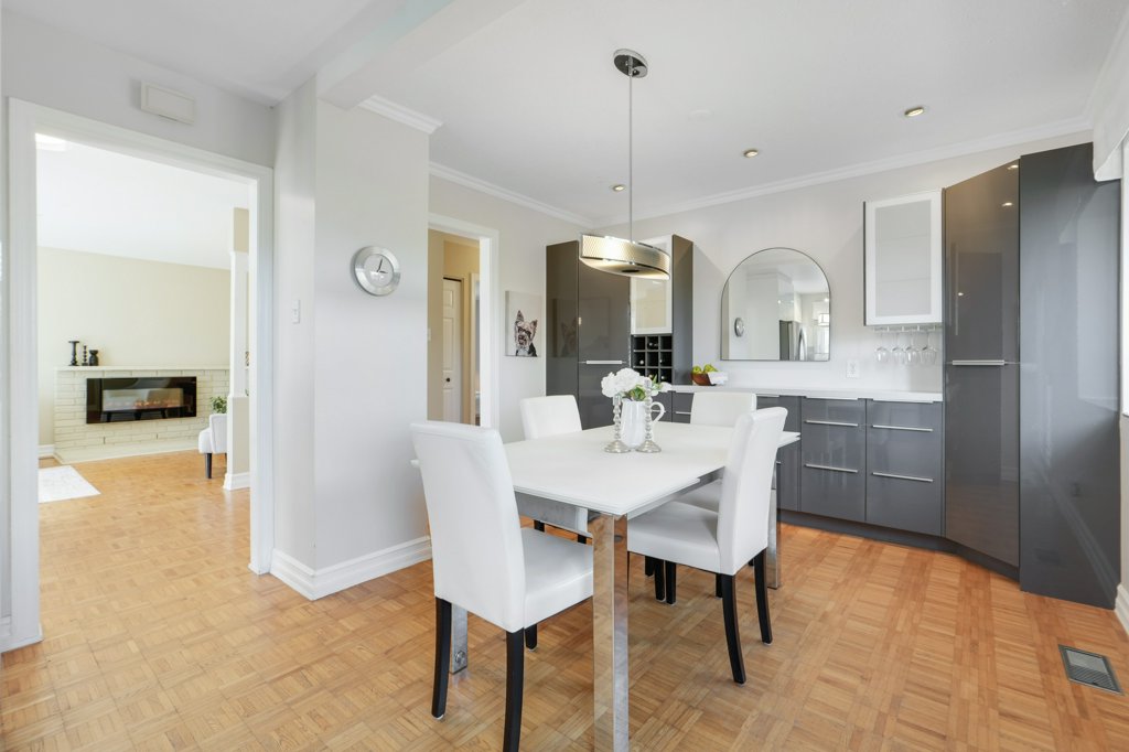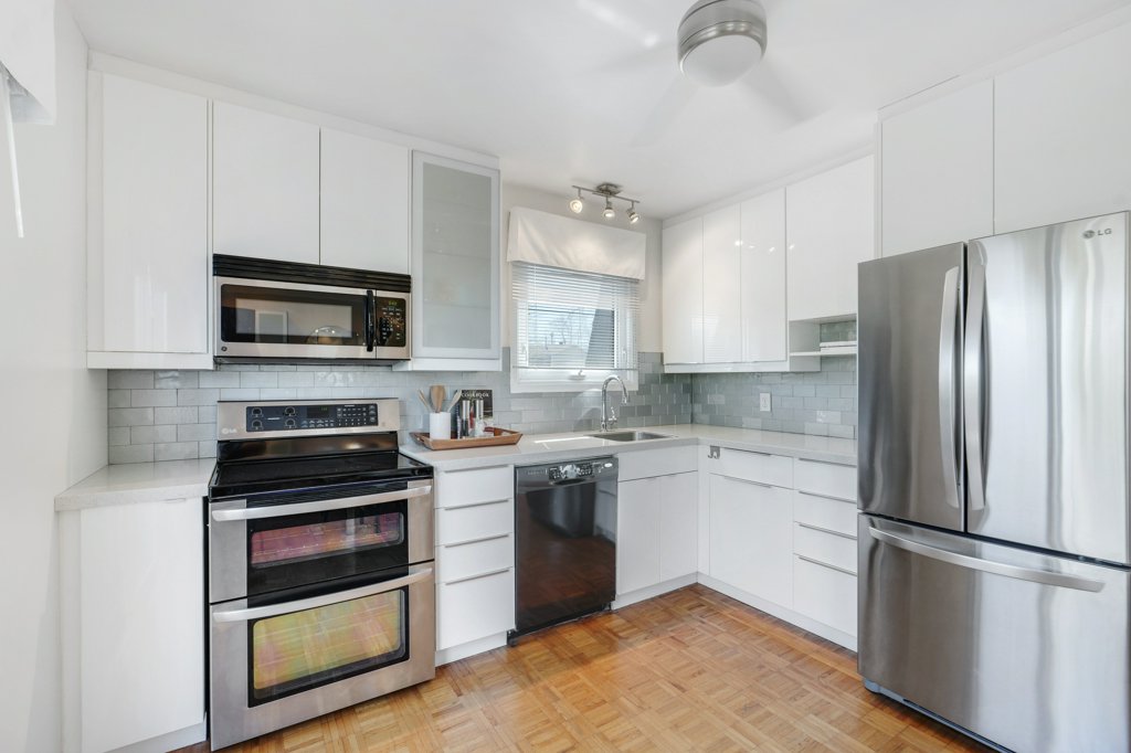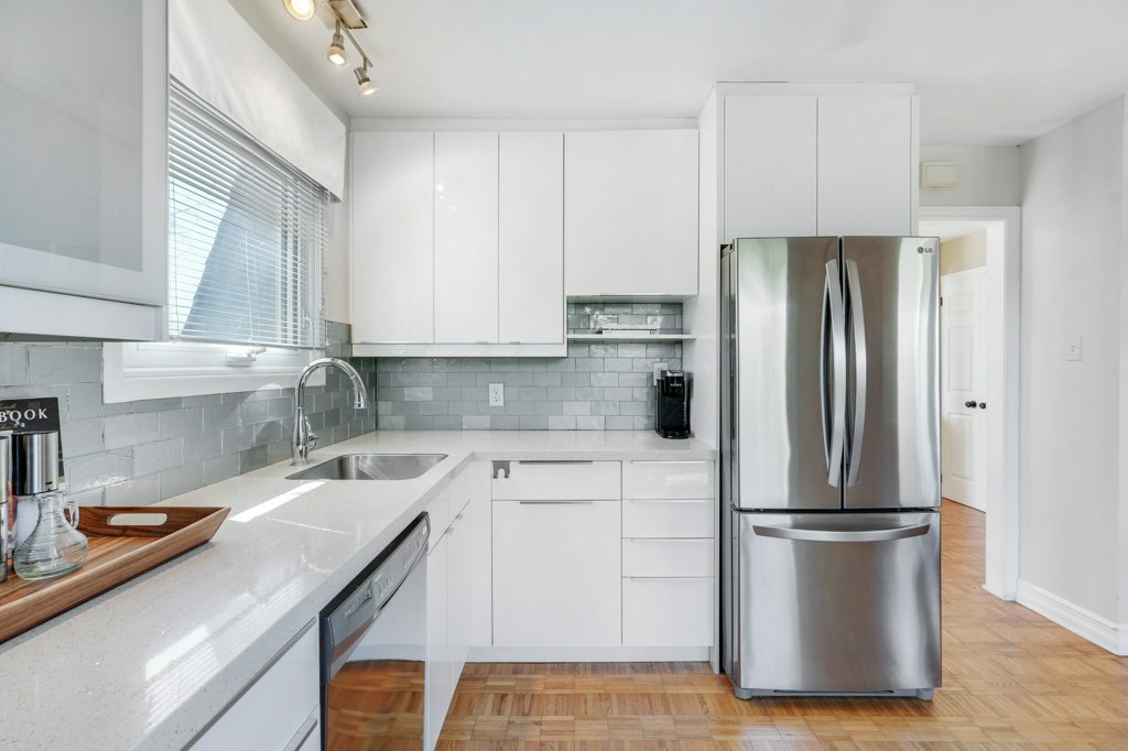 The open-concept contemporary kitchen/dining area presents with real pizazz, featuring white quartz counters, glass subway-tile backsplash with stainless steel appliances and white lacquered cabinetry. The dining room features custom-built-in cabinetry with coordinating gray accents to tie the space together. On the fully finished lower level, there’s a cozy family room, 2 additional bedrooms, and a 3-piece bathroom with a walk-in shower.
