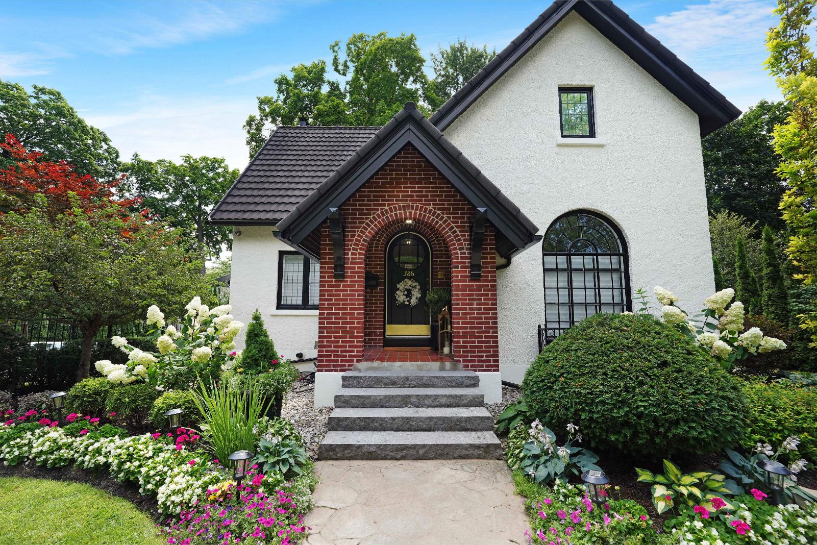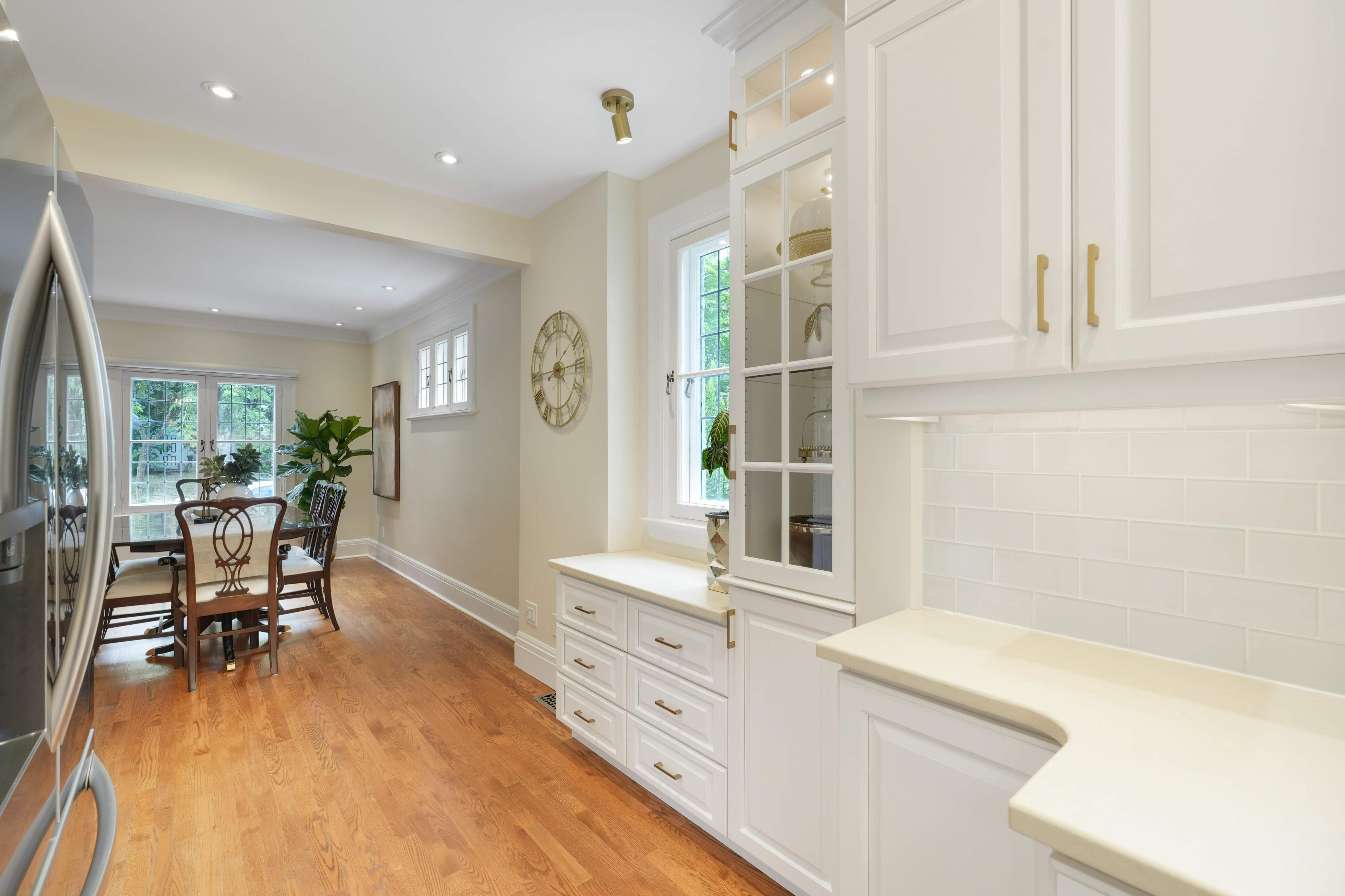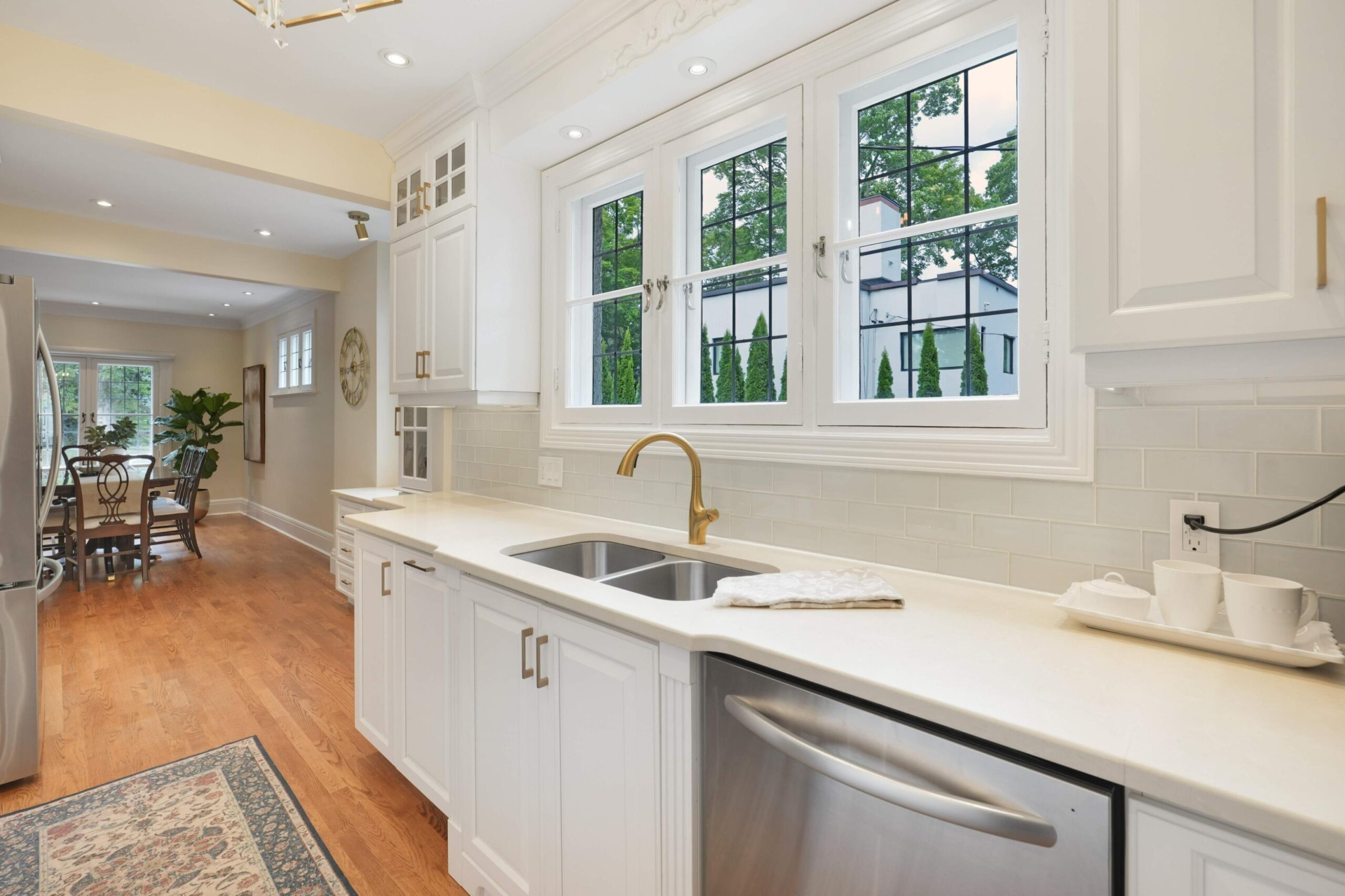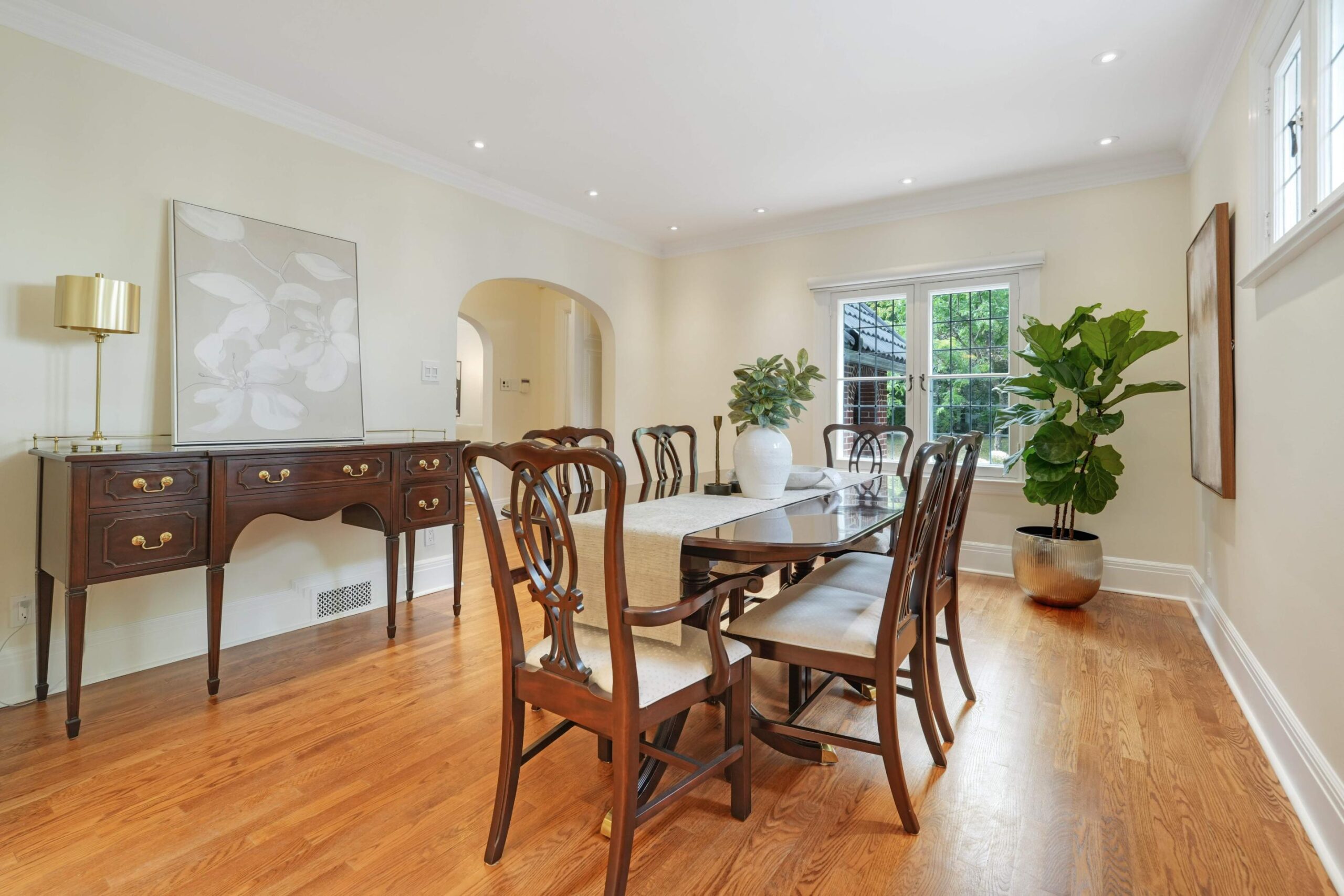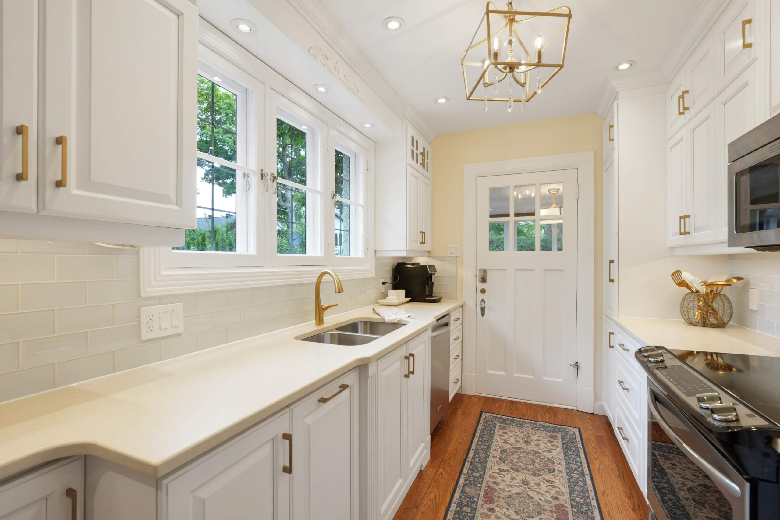 Inside, the home showcases a beautiful blend of old-world craftsmanship and modern convenience. Traditional details such as leaded glass windows, arched hallways, and quarter-sawn oak floors preserve the character of the home, while the wood-burning fireplace in the formal living room enhances its warmth and charm. Thoughtful updates, including renovated bathrooms and a stylish, contemporary kitchen, complement these classic features.
