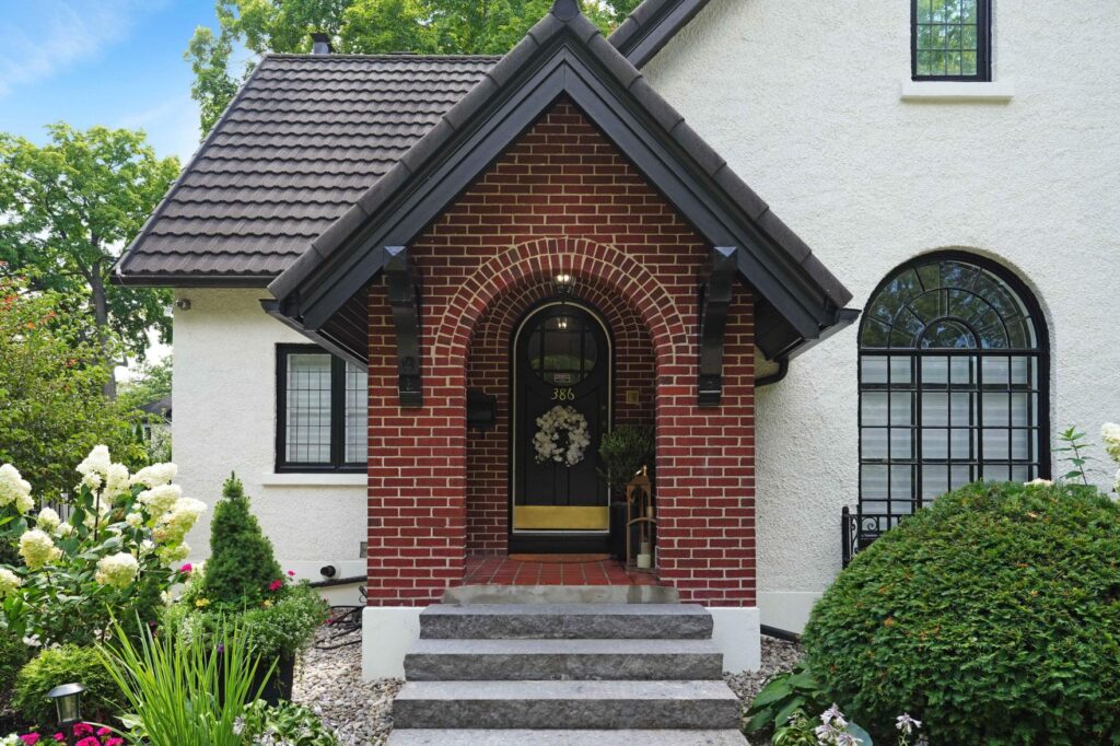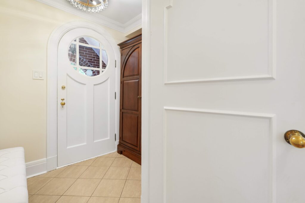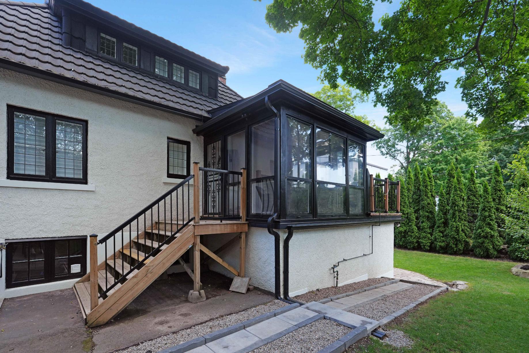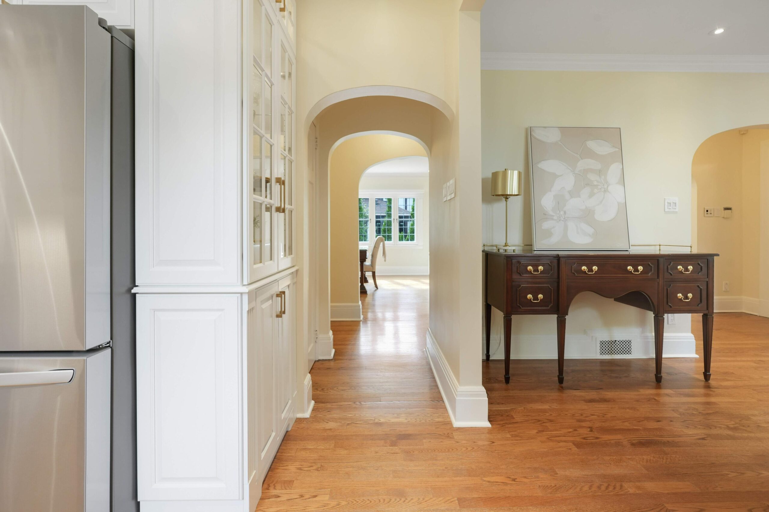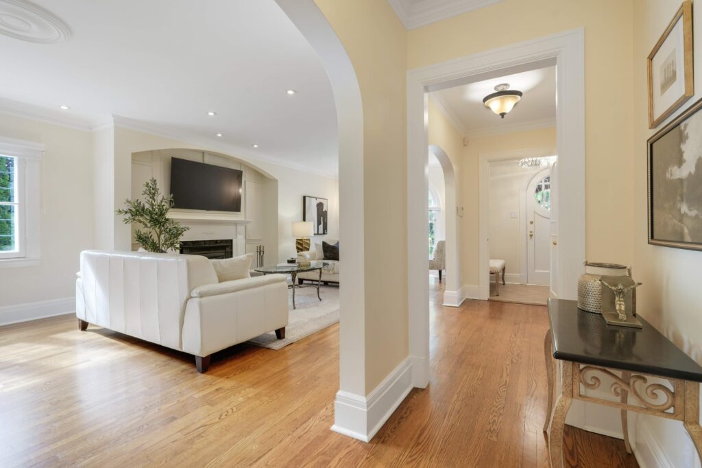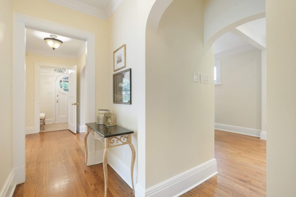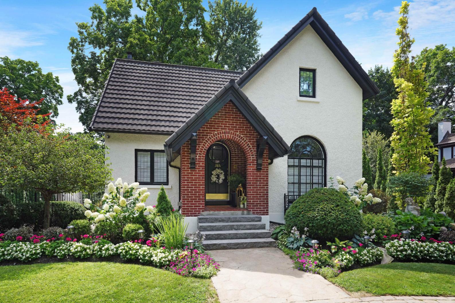 Inside, the home showcases a beautiful blend of old-world craftsmanship and modern convenience. Traditional details such as leaded glass windows, arched hallways, and quarter-sawn oak floors preserve the character of the home, while the wood-burning fireplace in the formal living room enhances its warmth and charm. Thoughtful updates, including renovated bathrooms and a stylish, contemporary kitchen, complement these classic features.