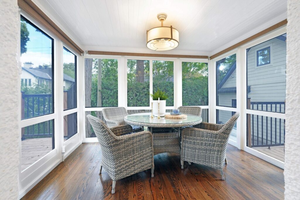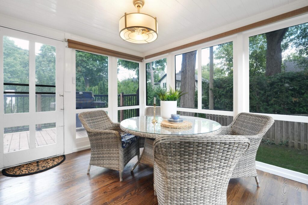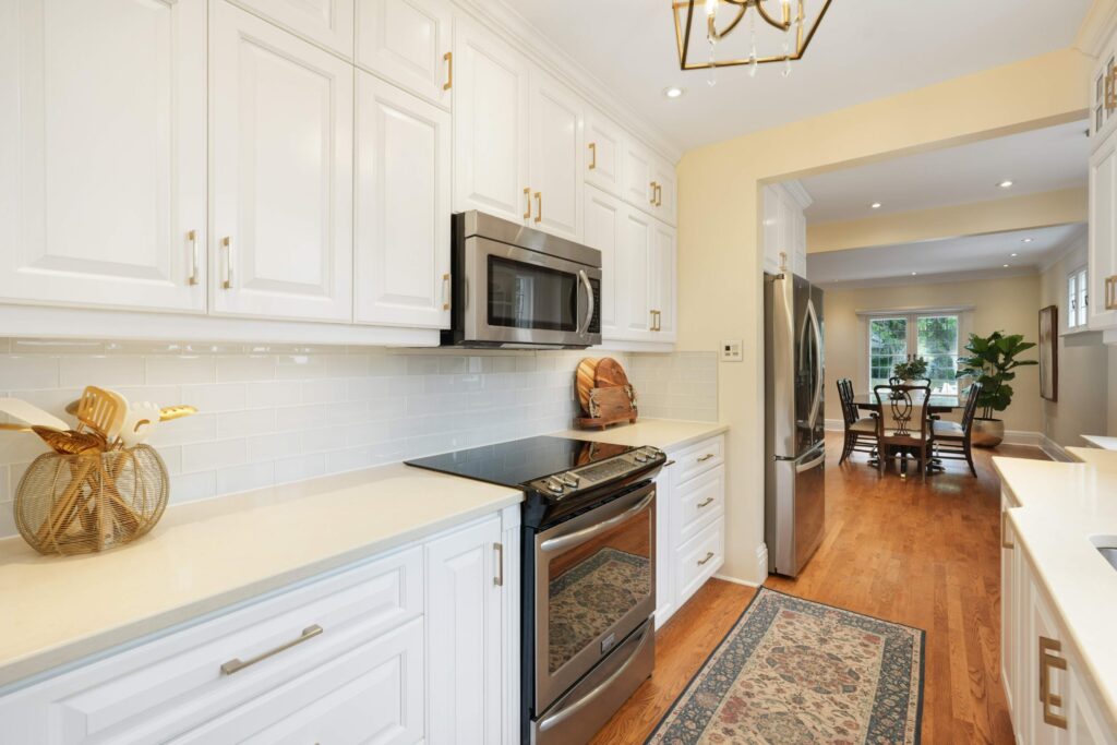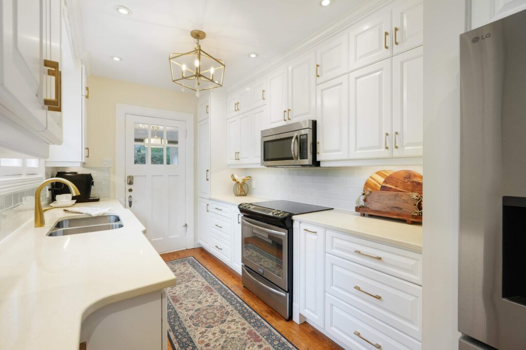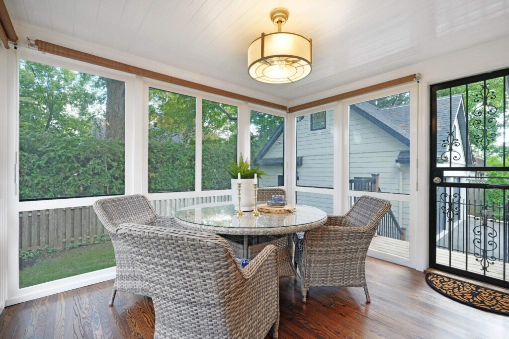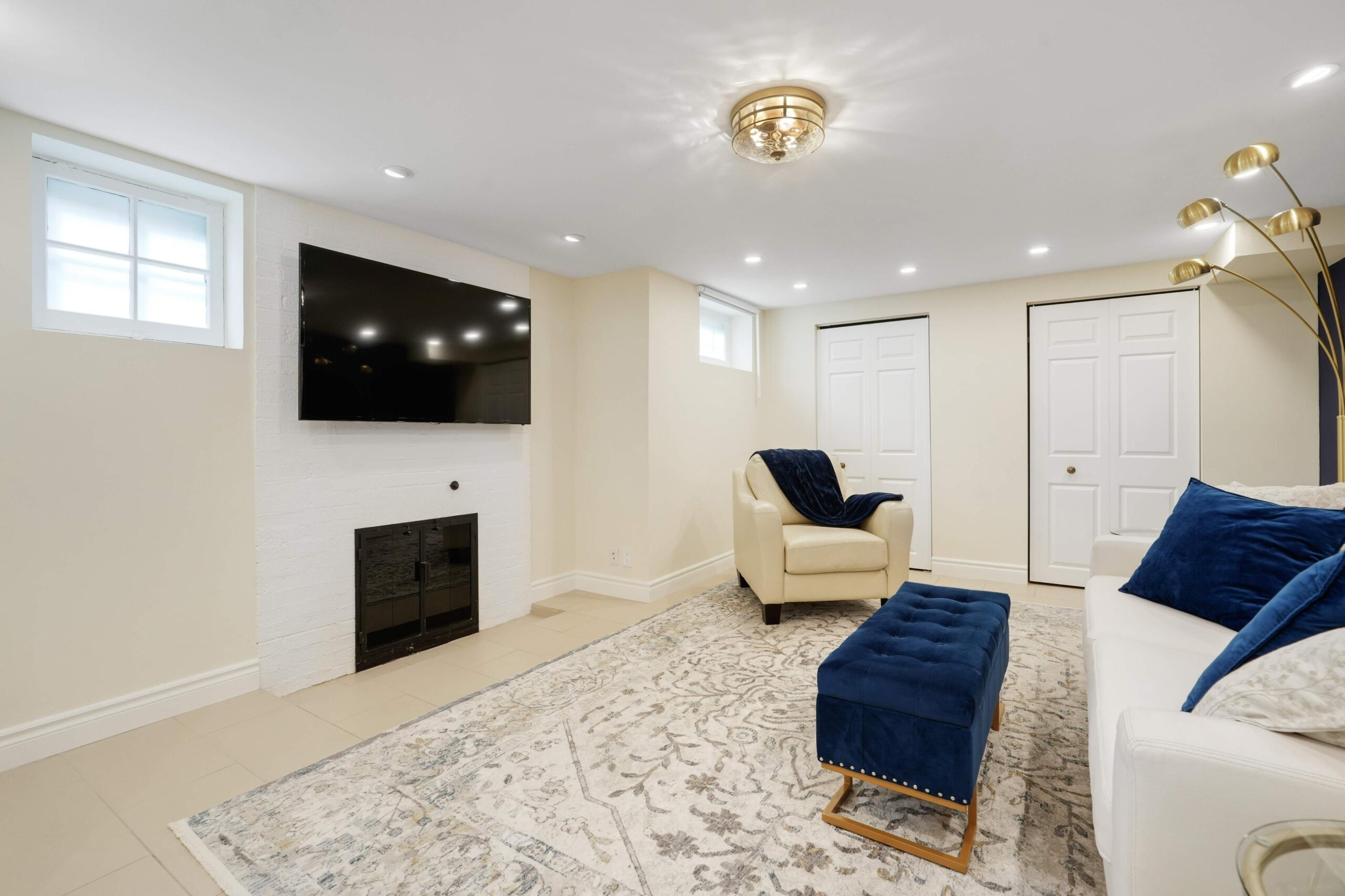 The upscale galley kitchen has been designed with both beauty and function in mind, boasting quartz countertops, a sleek glass backsplash, and high-quality stainless steel appliances. From here, the space flows naturally into a welcoming screened porch, ideal for enjoying warm evenings and breezy afternoons throughout the spring and summer months.